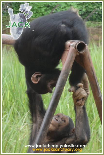 UN JOUR, UNE IMAGE – Tommy (en bas) et Ekolo sont deux jeunes mâles remplis d’énergie. Ils sont souvent ensemble et aiment beaucoup jouer, faire des bêtises… enfin, être des petits chimpanzés de leur âge!!