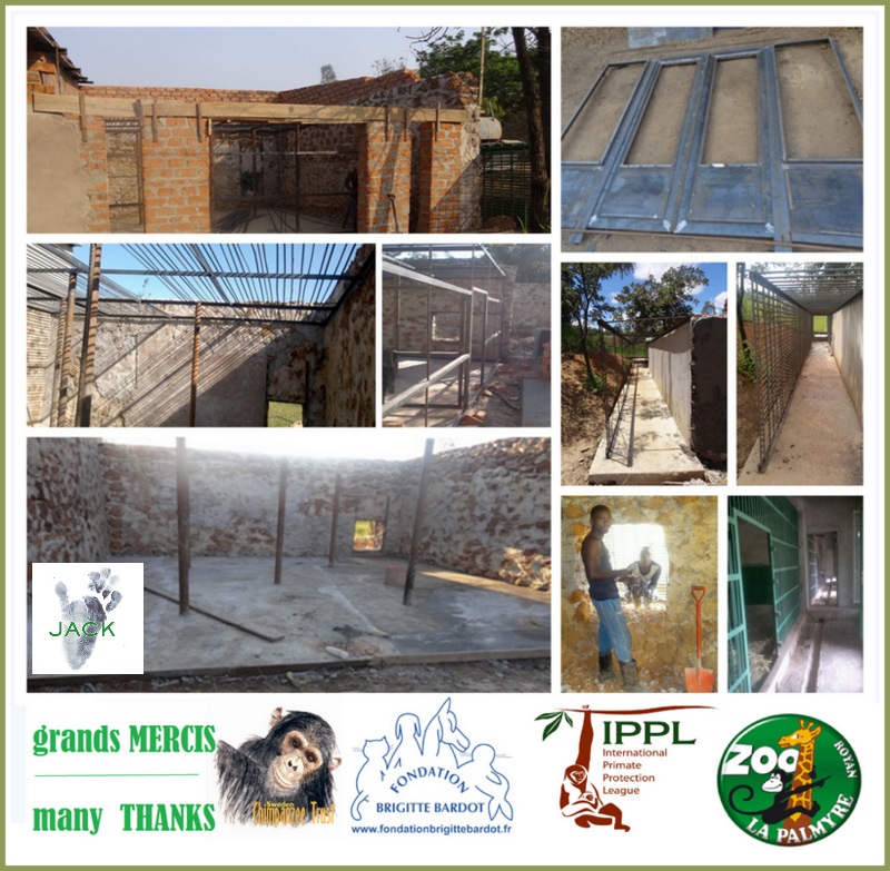 Ces aménagements 2014 de la Nurserie 2 ne se sont pas faits tout seuls! En effet, comme pour tout, J.A.C.K. dépend de la générosité de ses amis et sponsors qui croient en son travail et qui lui font confiance. C’est ainsi que pour l’année 2014, ce projet a pu faire un sérieux bond en avant que grâce à la précieuse intervention de nos sponsors: le Sweden Chimpanzee Trust & Great Words, le Fondation Brigitte Bardot, l’International Primate Protection League et le Zoo de La Palmyre. Sans EUX, nous ne n’aurions pas pu faire ces constructions indispensables au bien être de nos jeunes pensionnaires. Les chimpanzés que nous avons sauvés grandissent et comme nous n’avons toujours pas les terres promises par l’Etat pour installer notre sanctuaire en forêt, nous sommes contraints d’aménager les terres que nous avons à ce jour à Lubumbashi pour donner de l’espace aux chimpanzés grandissants… Nous espérons pouvoir enfin terminer le Projet Nurserie 2 cette année. Nous sommes à la recherche de fonds pour construire les nids, aménager tout le système de plomberie, installer la clôture électrique et construire des modules de jeux dans l’enclos extérieur… encore un vaste boulot en perspective mais tellement essentiel aux besoins de nos jeunes amis poilus…
