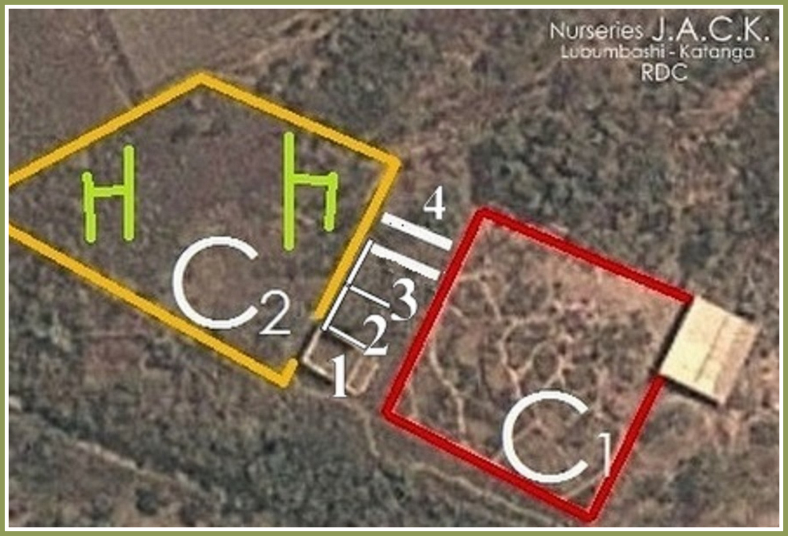 C1= Nurserie 1 – C2 = Nurserie 2 – 1,2,3 = loges de nuit et 4 = tunnel