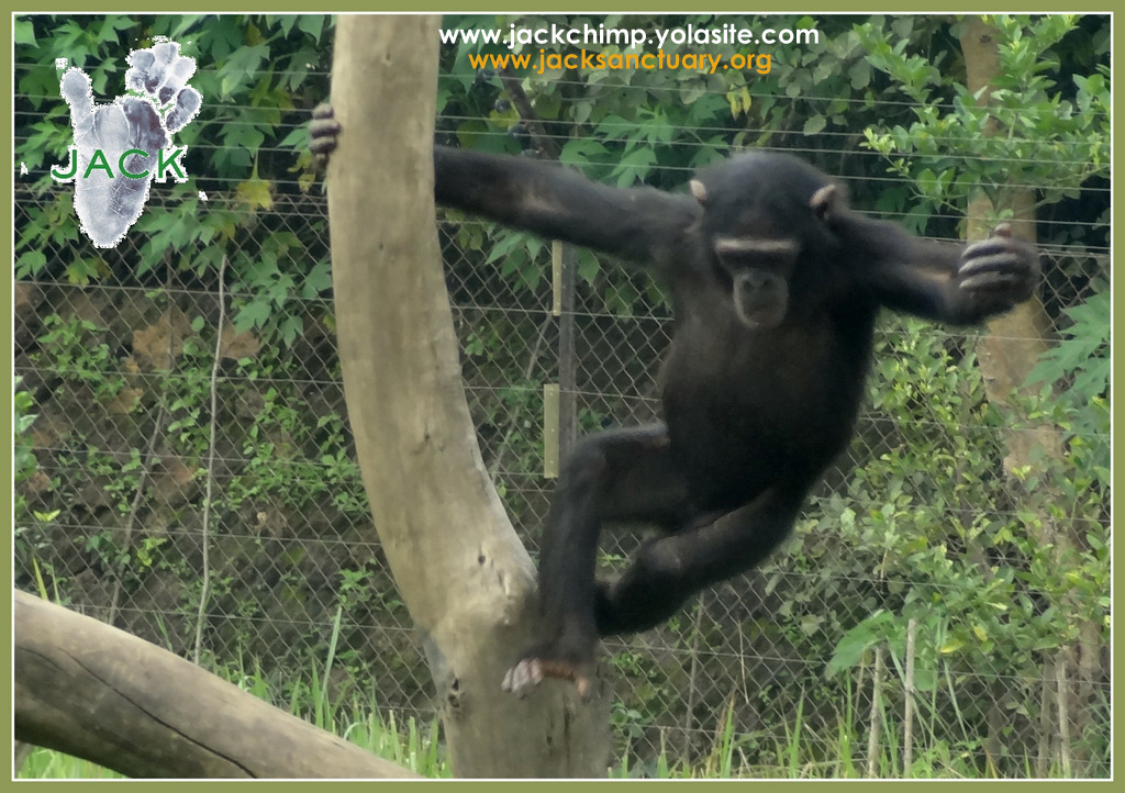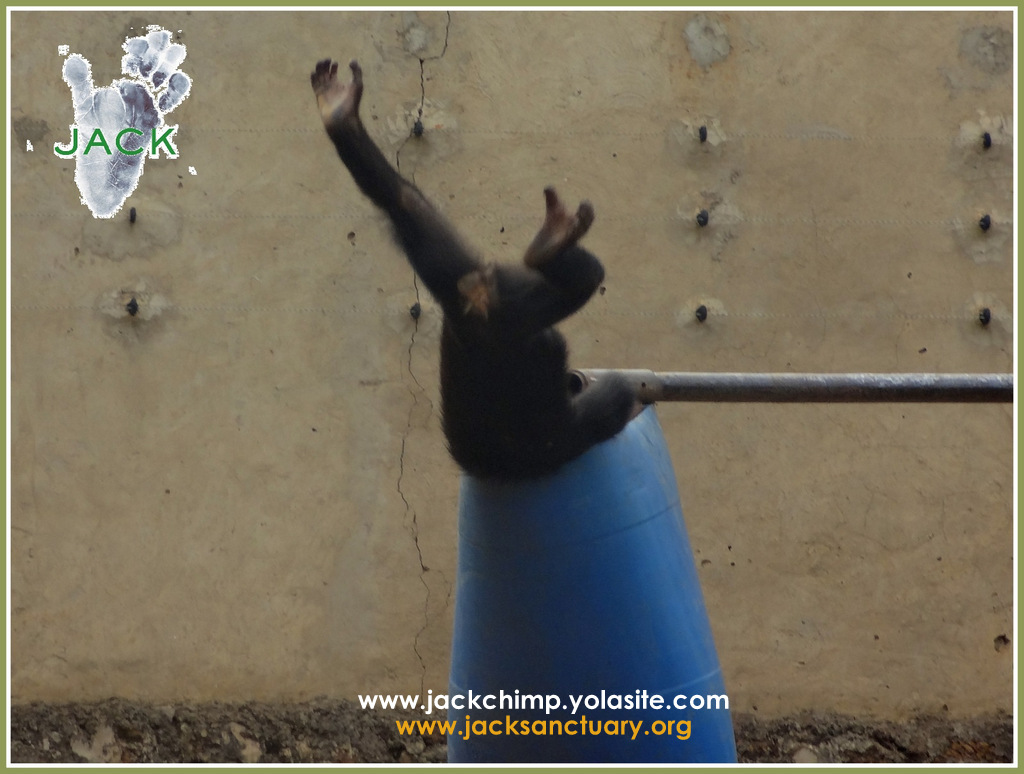 Nous avons donc pris ce mal en patience, et en plusieurs années de travail (exercices de motricité des doigts avec des petites balles souples, des jeux , etc), Kimo est devenu un chimp comme les autres et, à ce jour, fait partie des chimps les plus cascadeurs et acrobates de son groupe!