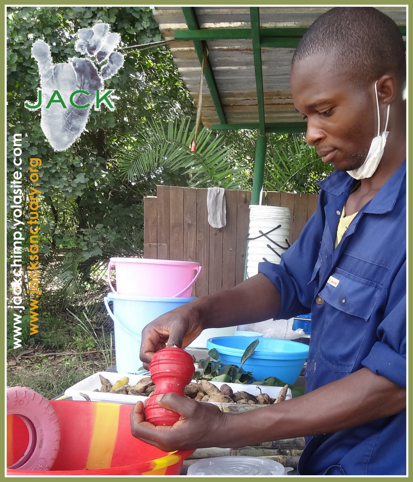 Voici notre soigneur Ngoy qui, formé par Karine, prépare les enrichissements du matin: fruits et feuillages frais, patates douces, …tant de bonnes choses que les chimps adorent!!