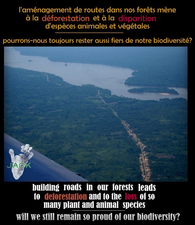 Une multitude de routes traversent actuellement nos forêts autrefois dites ‘vierges’ pour aller créer des mines, exploiter le sol et profiter un maximum de ces richesses cachées au détriment de la faune, de la flore mais aussi des populations avoisinantes. Les routes facilitent et augmentent le braconnage, détruisent et fragmentent l’habitat de milliers d’espèces animales, apportent des maladies humaines dans nos forêts, détruisent une quantité inimaginable de plantes et entachent les cultures ancestrales des habitants de la forêts.