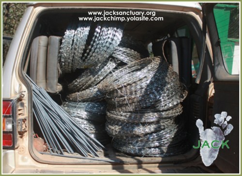 Comme mentionné il y a peu, suite à la visite de personnes indésirables sur notre site, notre priorité a été d’améliorer la sécurité du Sanctuaire. Certains Amis de JACK aux USA ont tenu à lancer une collecte afin de nous aider à acheter le matériel (fils barbelés, fer ronds, carburant poste à souder, etc) et…les travaux ont pu commencer car nous avons déjà pu acheter la majorité du matériel !!!