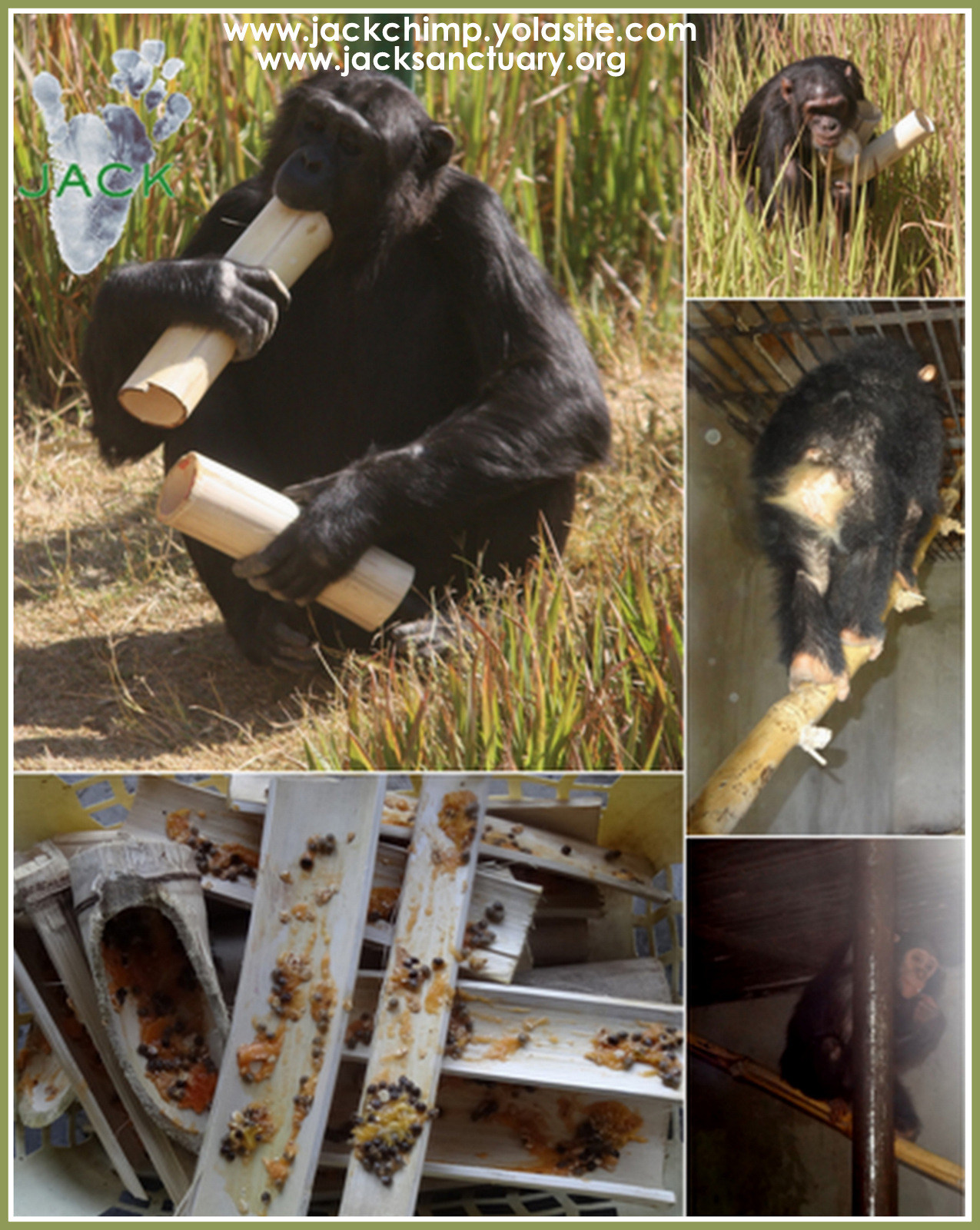 IMAGES DU JOUR – oui, le bambou est un matériau très solide qui en général résiste à la force de canines des chimps!! A J.A.C.K. , nous tentons de trouver divers types de matériaux pour développer l’enrichissement de nos pensionnaires et le bambou est utilisé tant à l’intérieur des structures qu’à l’extérieur… c’est un outil simple et très facile à entretenir! les chimps adorent!!!