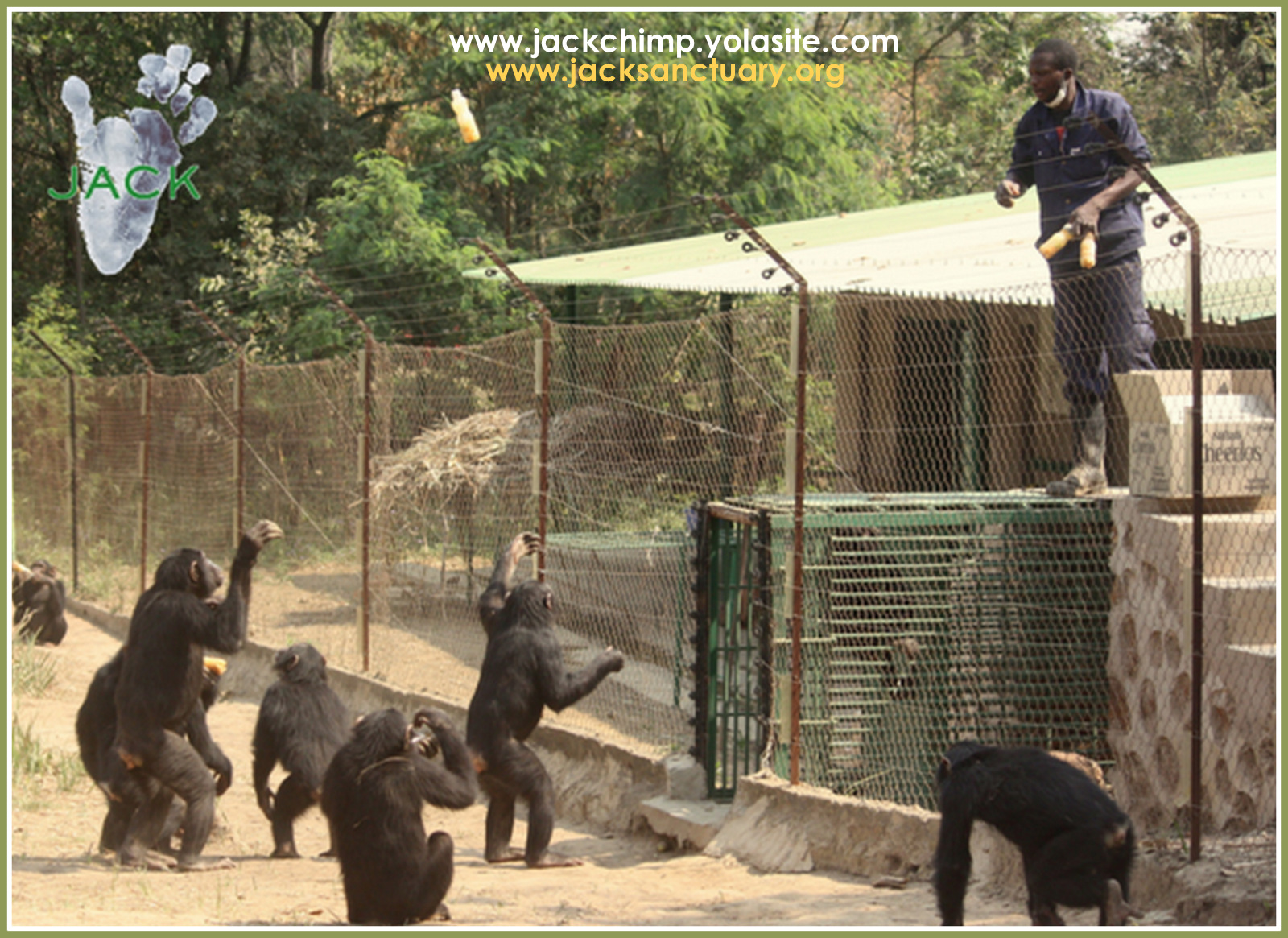 UN JOUR, UNE IMAGE – il fait fort chaud ici déjà les aprems et aujourd’hui nous avions réservé des surprises glacées pour nos amis chimpanzés: des bouteilles de plastique remplies de fruits frais congelées… aujourd’hui, la distribution est faite par notre soigneur en charge de l’enrichissement de ce dimanche: Papa Ngoy!