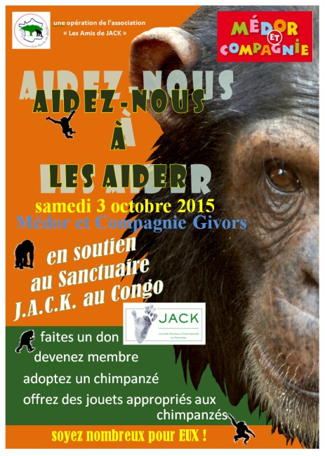 En effet, notre association française, LES AMIS DE JACK, organise collecte et stand informatif dans la boutique MEDOR ET COMPAGNIE le samedi 3 octobre prochain à Givors (69)! Cet événement ne peut se faire que grâce au grand coeur de Mr et Mme KAHN, les gérants de la boutique, mais aussi et surtout grâce à l’engagement inconditionnel d’une de nos marraines: Lucette que nous remercions à nouveau chaleureusement pour tout ce qu’elle fait pour les chimpanzés sauvés par notre sanctuaire!