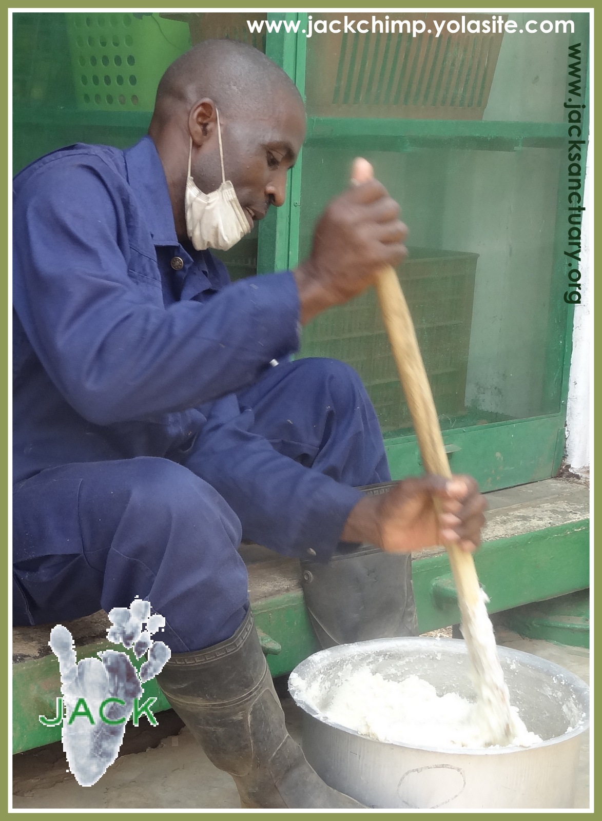 UN JOUR, UNE IMAGE – le ‘bukari’ ou aussi appelé ‘fu fu’ est le repas traditionnel congolais fait à base de farine de maïs. Les chimps raffolent également du bukari et en reçoivent au quotidien. Ce matin, c’est Papa Jérémie qui est en charge de préparer les 120 boulettes de bukari pour la journée.