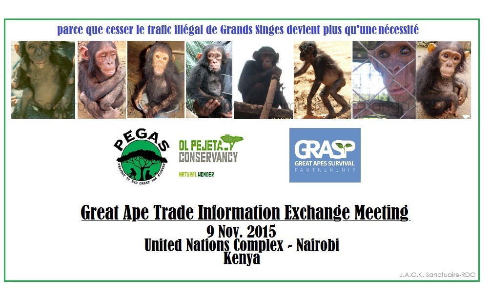 Aujourd’hui,Franck est au bureau des Nations Unies de Nairobi où il fait partie de la délégation du PASA qui participe à la réunion organisée par PEGAS & GRASP. Faut savoir que notre première mission en créant l’orphelinat a été de cesser le trafic illégal de chimps à Lubumbashi (en moyenne 3 bébés/par mois arrivaient de la forêt pour y être vendus ou pour transiter avant de traverser les frontières!) et que depuis 2010 plus aucun chimp n’a été vu à la vente dans les rues de la ville. J.A.C.K. est ainsi arrivé à stopper le commerce illégal de chimp dans le Sud de la RDC et cela ne s’est pas passé sans sacrifices ni obstacles…