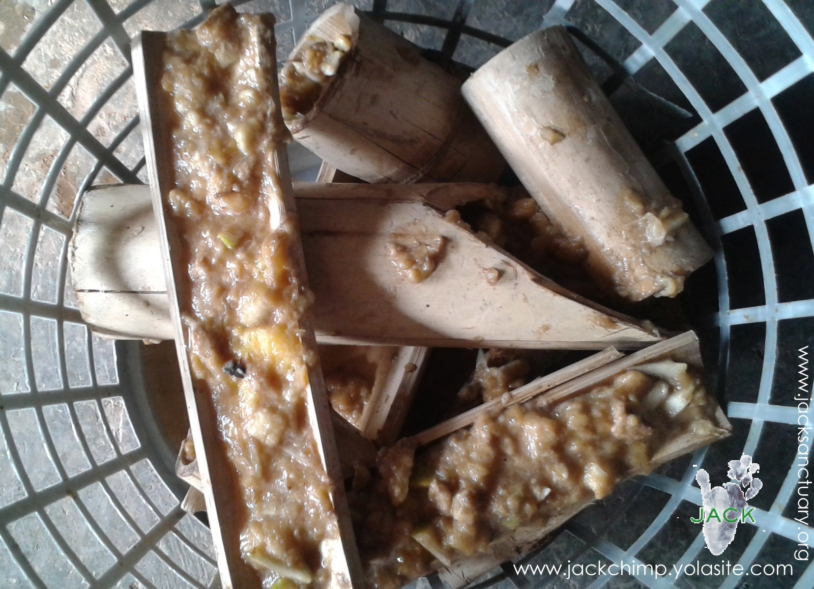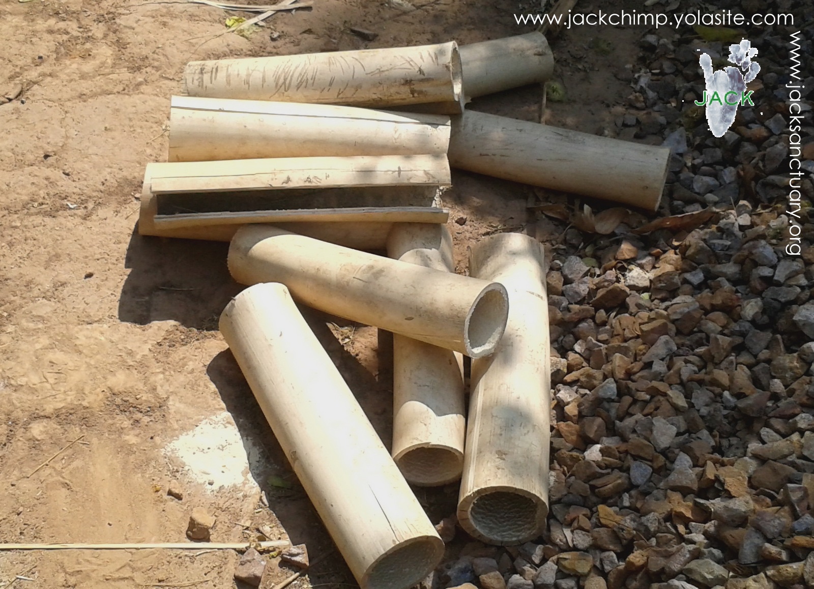 UN JOUR, DES IMAGES – le bambou est un excellent outil pour l’enrichissement de nos pensionnaires. Cependant, comme celui-ci résiste peu aux dents et à la force des chimps, il nous faut le remplacer très régulièrement! Ici, Papa Jérémie coupe des morceaux de bambous qui seront utilisés le lendemain pour enrichir l’environnement de nos amis…