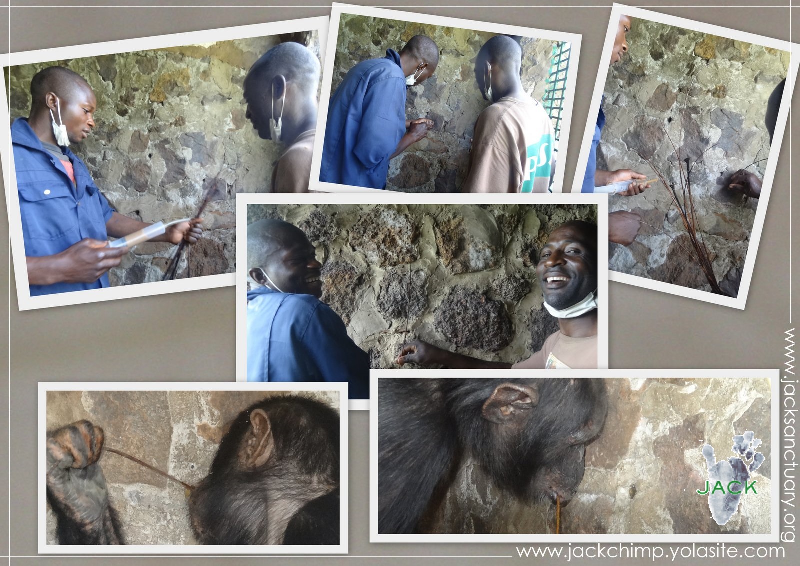 UN JOUR, DES IMAGES – l’enrichissement est excellent pour nos pensionnaires et il semble qu’il procure également de bons moments à nos soigneurs…. Papa Ngoy (gauche) montre à son collègue, Papa Jérémie, comment remplir les trous à l’aide de la seringue… bien sur, Ngoy n’a pas hésité à y ajouter une touche d’humour!!!