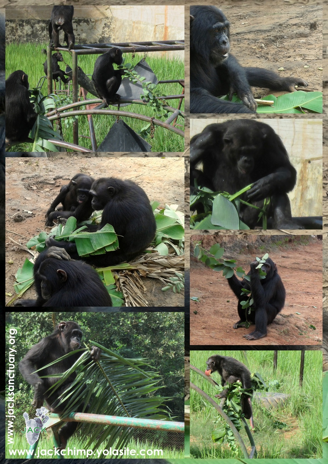 UN JOUR, DES IMAGES – ce matin, il faisait un magnifique soleil qui nous changeait franchement de la grisaille et des pluies des jours précédents! Les chimps étaient surexcités de pouvoir pointer le nez dehors, de jouer avec les feuillages frais ainsi que de manger les morceaux de troncs de bananiers mis à leur disposition dans les espaces externes comme enrichissement !