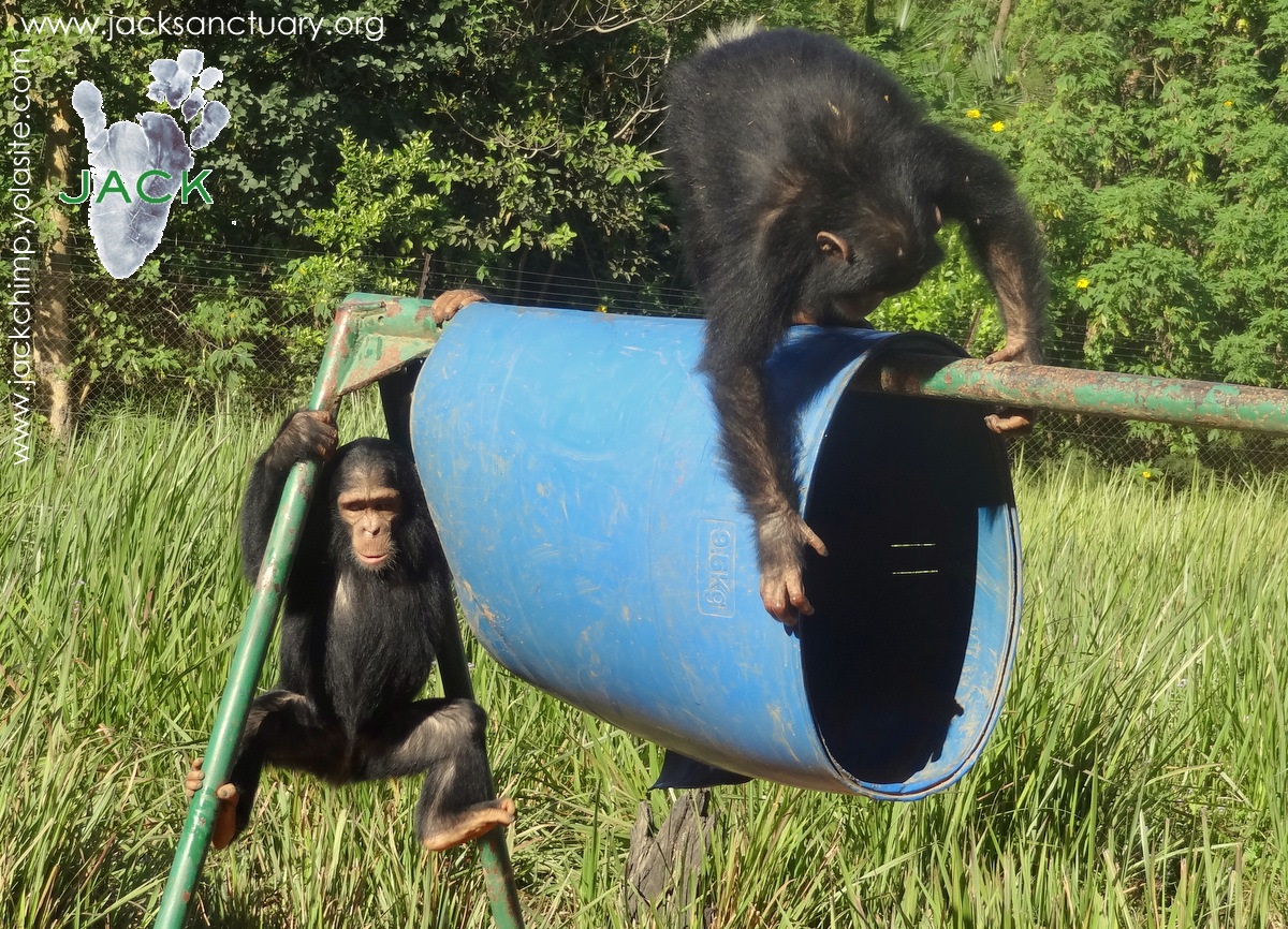 UN JOUR, UNE IMAGE – notre attention est centrée sur Bihati mais nous ne négligeons pas pour autant les 38 autres chimpanzés du sanctuaire. La vie continue et chacun en profite pleinement. Voici Mata (gauche) qui, avec Luna (en haut), tente d’attraper petite Kaly bien cachée dans le tonneau!