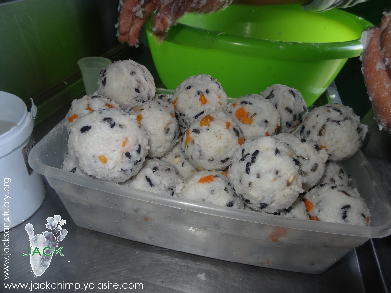 UN JOUR, DES IMAGES – Julie, notre volontaire lushoise, a préparé ce matin en guise d’enrichissement des boules de riz mélangées à des carottes, un peu de banane et des semences de tournesol… il y en a de ceux qui seront contents ce soir!!!!
