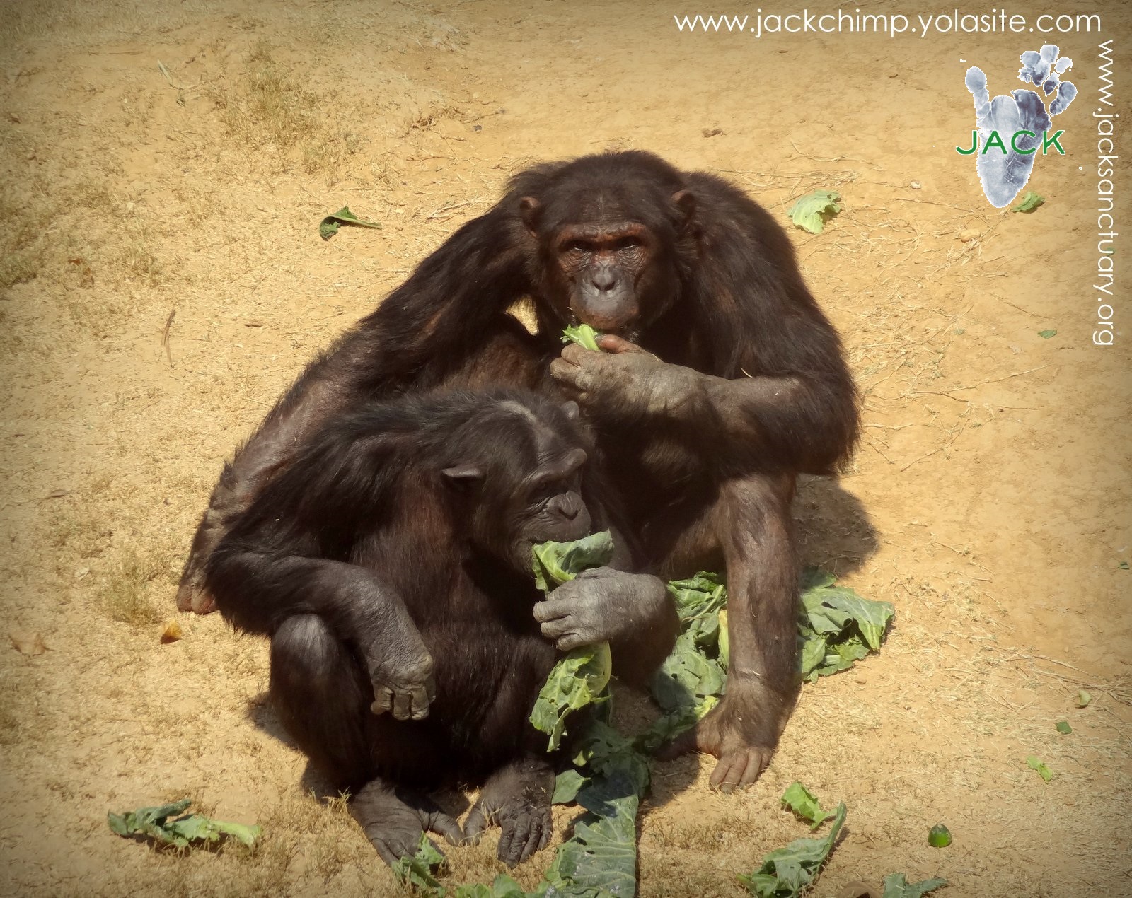 UN JOUR, UNE IMAGE – Déjeuner en tête à tête entre les dominants de notre groupe de base: Mwisho (mâle à l’arrière) et la grande Shasa … sauf que Shasa préfère tourner le dos au chef histoire qu’il ne lui chipe pas ses feuilles de choux!