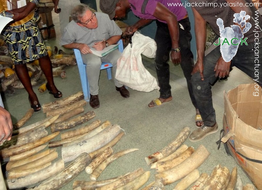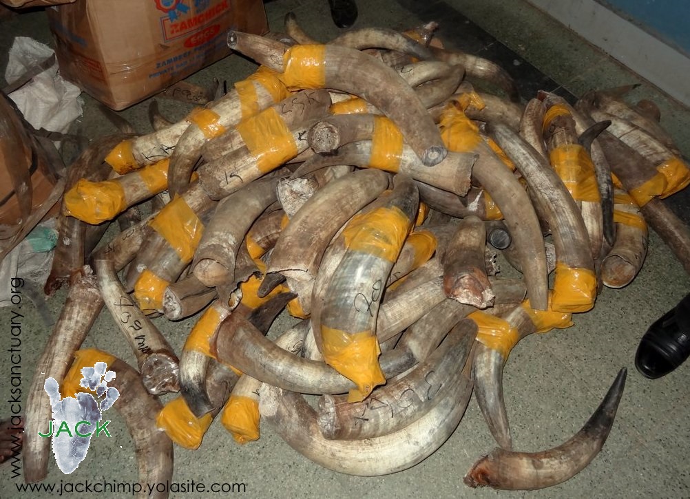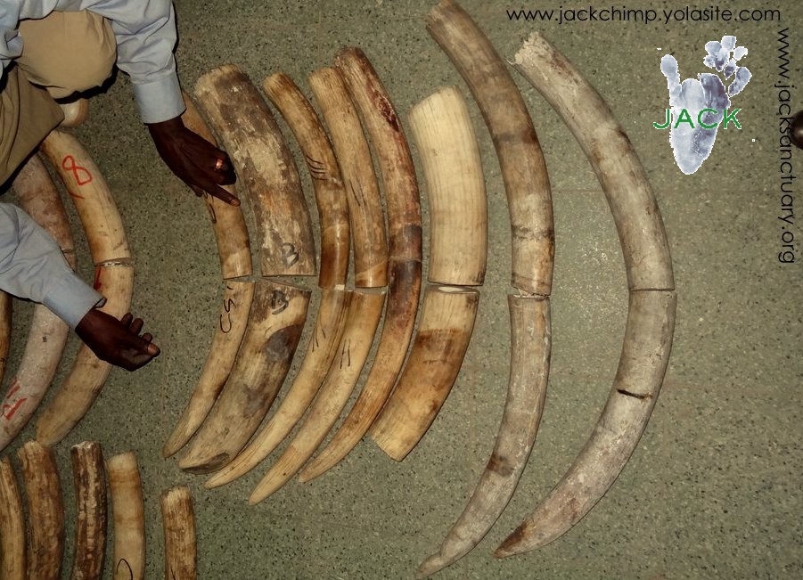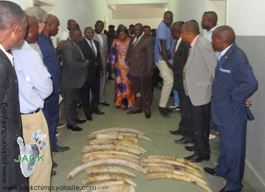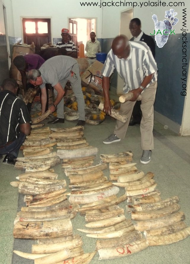 J.A.C.K., dont la mission de base est de cesser le trafic illégal d’espèces menacées (mortes ou vivantes) et de renforcer les lois en matières fauniques, a donc été appelé par les autorités de la place afin de les aider et de les conseiller dans cette confiscation qui, à notre connaissance, est LA PLUS GRANDE SAISIE D’IVOIRE jamais réalisée au Katanga !