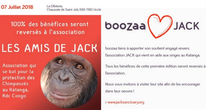 Oui, rappelez-vous, BOOZAA est un groupe d’amis qui a vécu/qui vit toujours en RD Congo et qui a désiré créer en événement à Bruxelles en juillet 2018 afin de se rassembler et de se retrouver… J.A.C.K. était mis à l’honneur à cette occasion par le biais d’un stand et de posters. BOOZAA a tenu Les bénéfices de ce premier événement ont été offerts au sanctuaire en RDC et ont permis de suivre les interventions et analyses médicales de BAPU.