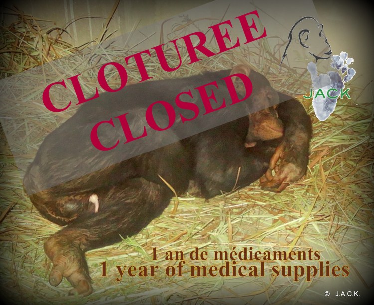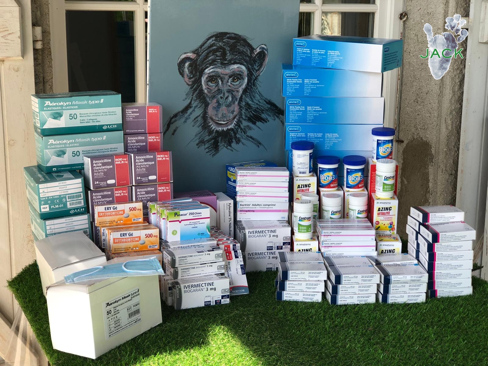Nous sommes très contents car cette cagnotte enlève une grosse épine du pied de J.A.C.K. : beaucoup de médicaments font défaut en RDC et ceux que l’on trouvent sont souvent hors de prix! Heureusement, grâce à votre générosité, notre association a pu acheter les traitements nécessaires pour l’année à venir de tous nos pensionnaires chimpanzés.