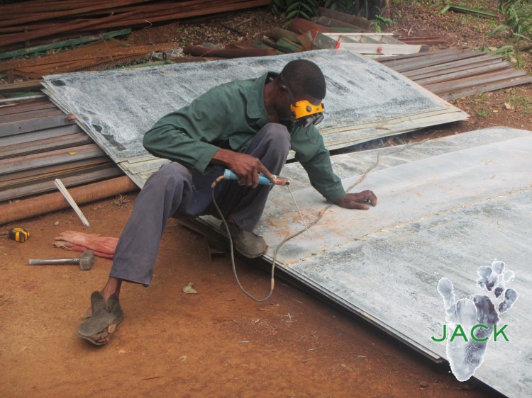 Les maçons ont fixé toute la structure métallique de base autour de l’enclos à ciel ouvert des chimpanzés du groupe « Nursery I » et Georges, le soudeur, est en train de souder l’ossature de métal- ossature sur laquelle seront fixés les immenses « boucliers » de sécurité déjà en pleine confection.