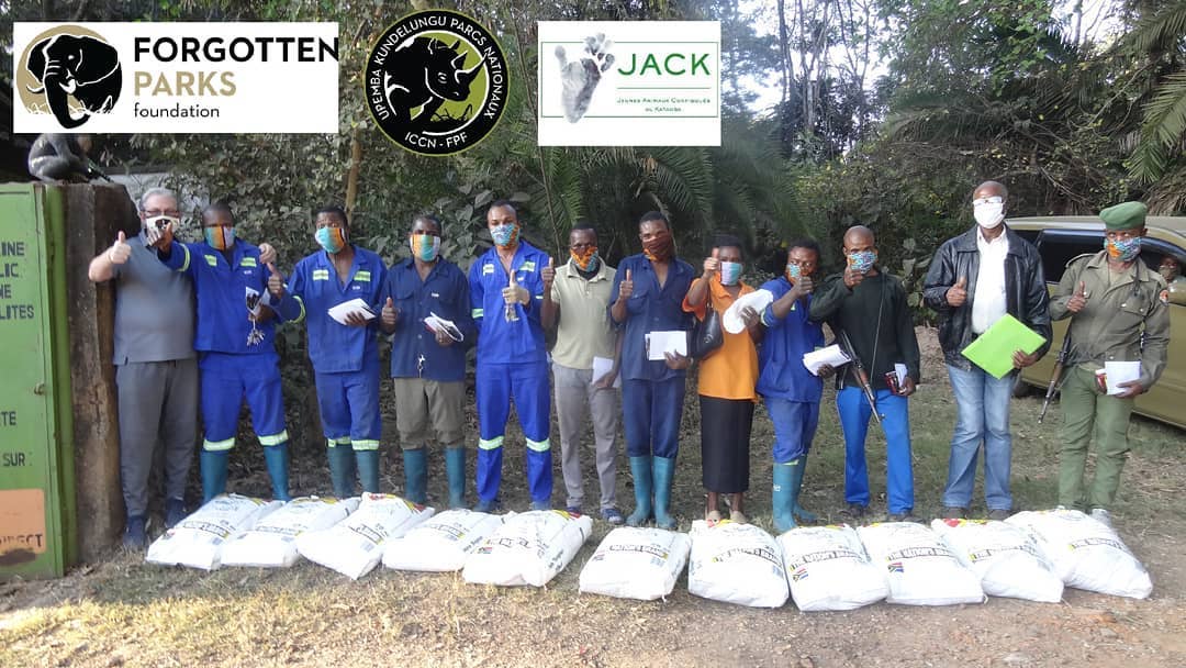 UN MAGNIFIQUE DON de farine de maïs et de masques pour chacun des membres de famille de notre équipe offerts par FORGOTTEN PARKS FOUNDATION via notre partenariat avec l’ICCN.
