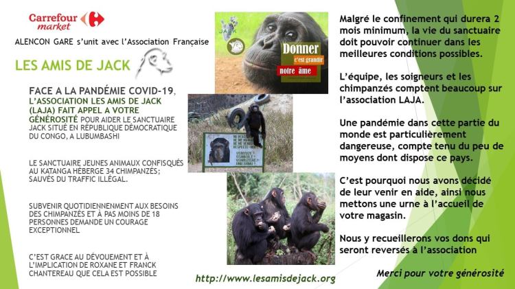 LE CARREFOUR MARKET D’ALENÇON GARE soutient notre action de Conservation d’une espèce en voie d’extinction : le chimpanzé en RD Congo!