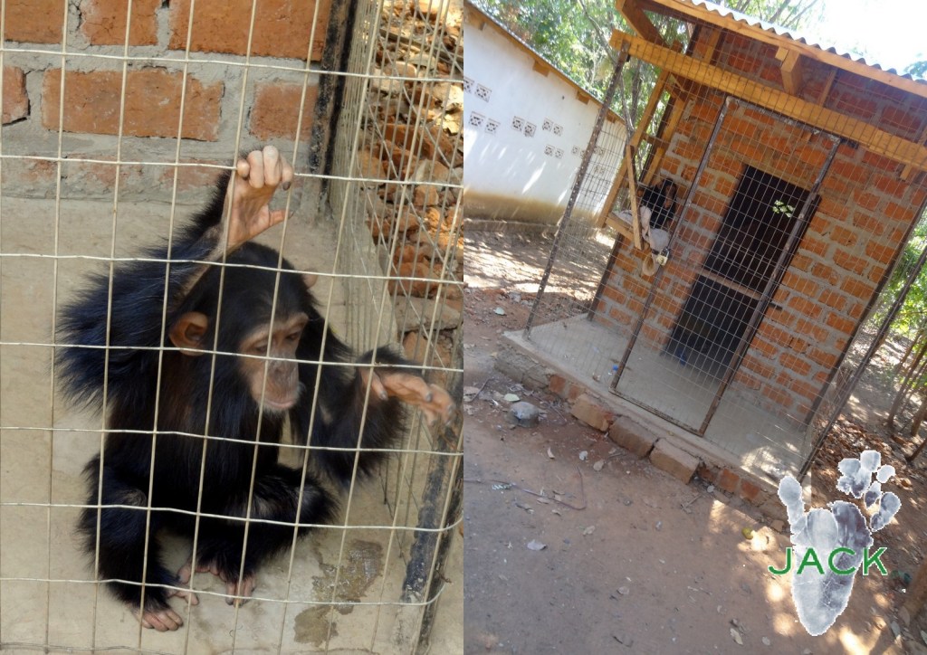 Le bébé chimpanzé était seul dans une cage grillagée et bétonnée. A la vue de l’équipe de J.A.C.K et de la nourriture que nous lui avions préparée, elle a de suite été très intéressée et a très vite sympathisé avec ses sauveteurs.