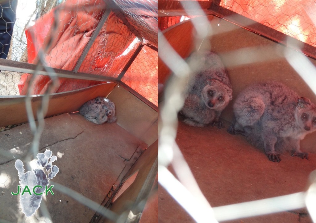 Apeurés et traumatisés, les galagos (prosimiens nocturnes) étaient en plein soleil et notre équipe a immédiatement couvert la cage d’une bâche tout en leur donnant à manger.