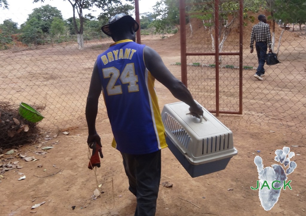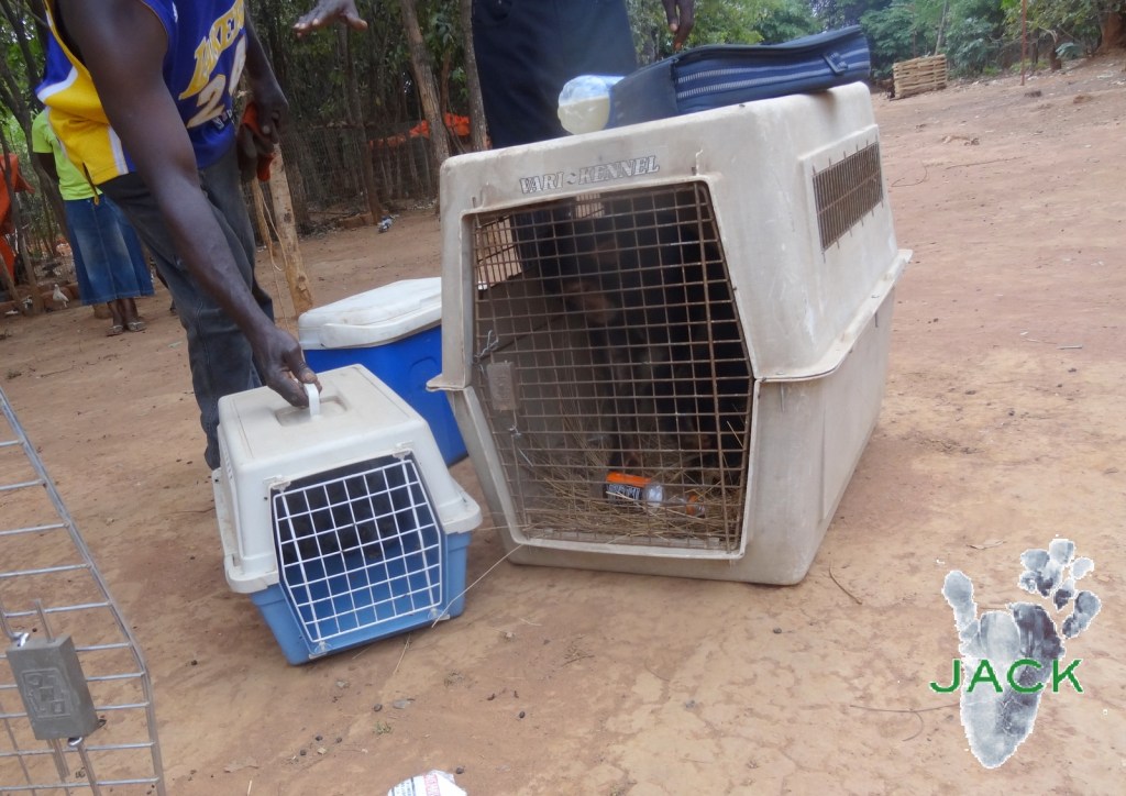 C’est ainsi que Mr Elie, notre collègue OPJ du Ministère de l’Environnement, accompagné d’une équipe et d’un véhicule de J.A.C.K. a pu confisquer une petite femelle chimpanzé ainsi que 2 bush babies (galagos).