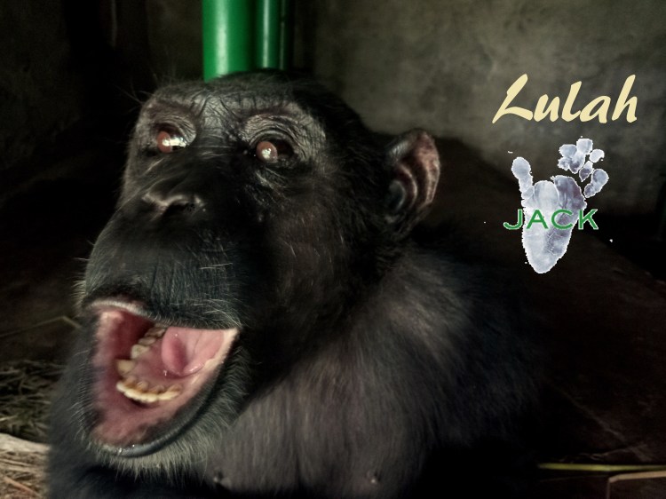 LULAH, NOTRE DERNIER SAUVETAGE est à présent très à l’aise et vocalise beaucoup avec les autres chimpanzés. Elle mange de mieux en mieux et c’est nécessaire pour récupérer les 10kgs qui lui manquent…