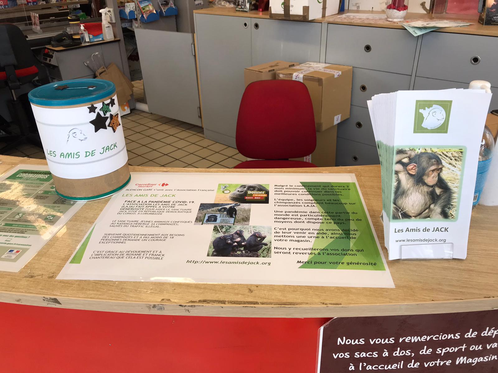 Tout comme en 2020 et malgré les caprices de la crise sanitaire, LE CARREFOUR MARKET D’ALENÇON GARE soutient notre action de Conservation d’une espèce en voie d’extinction : le chimpanzé en RD Congo!