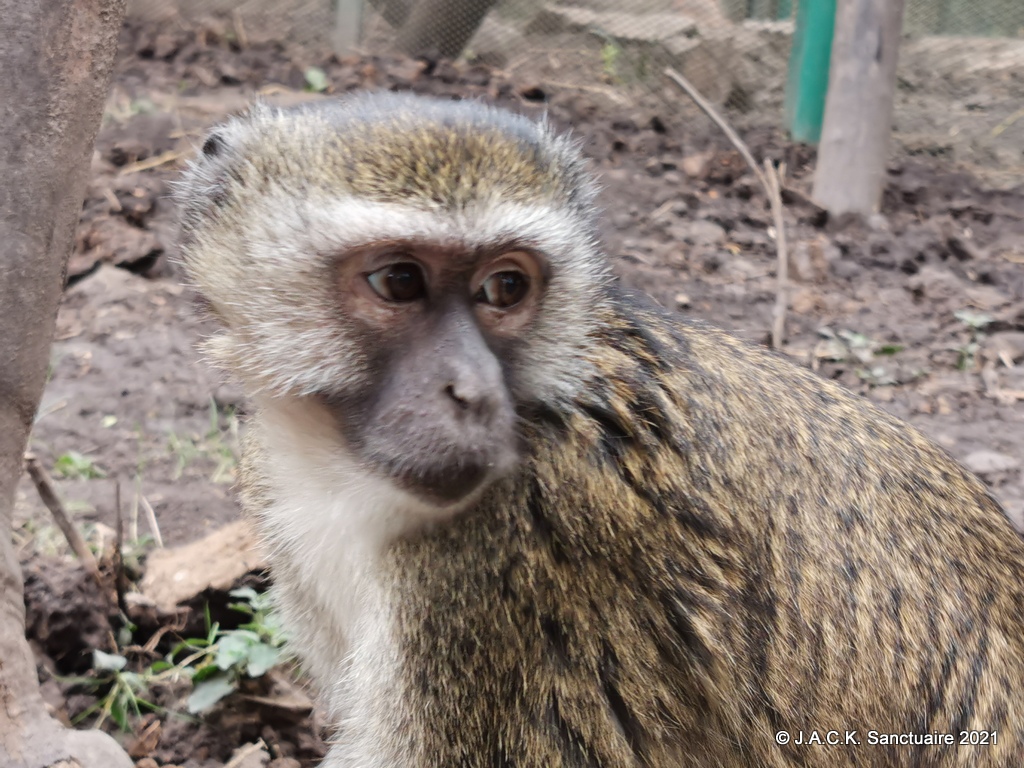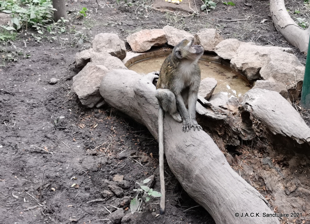 POLA est une femelle Malbrouck âgée. Elle vient d’être récupérée ici à Lubumbashi après avoir été gardée 12 ans chez des gens qui, après toues es années, ne souhaitaient plus l’avoir chez eux…