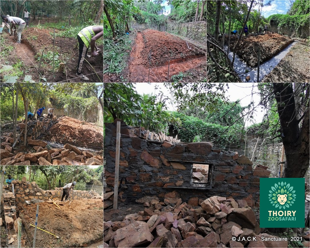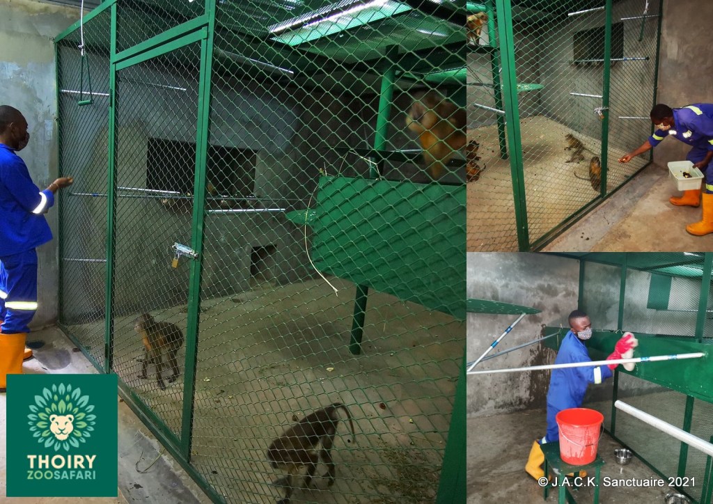 Soucieuse du bien-être des mangabeys dorés que J.A.C.K. a ramenés du Zimbabwe, la Direction du Zoo Safari de Thoiry et de son association THOIRY CONSERVATION (le fond de dotation du safari Parc de Thoiry) a accepté de contribuer à l’aménagement de loges de nuit pour les 11 individus.