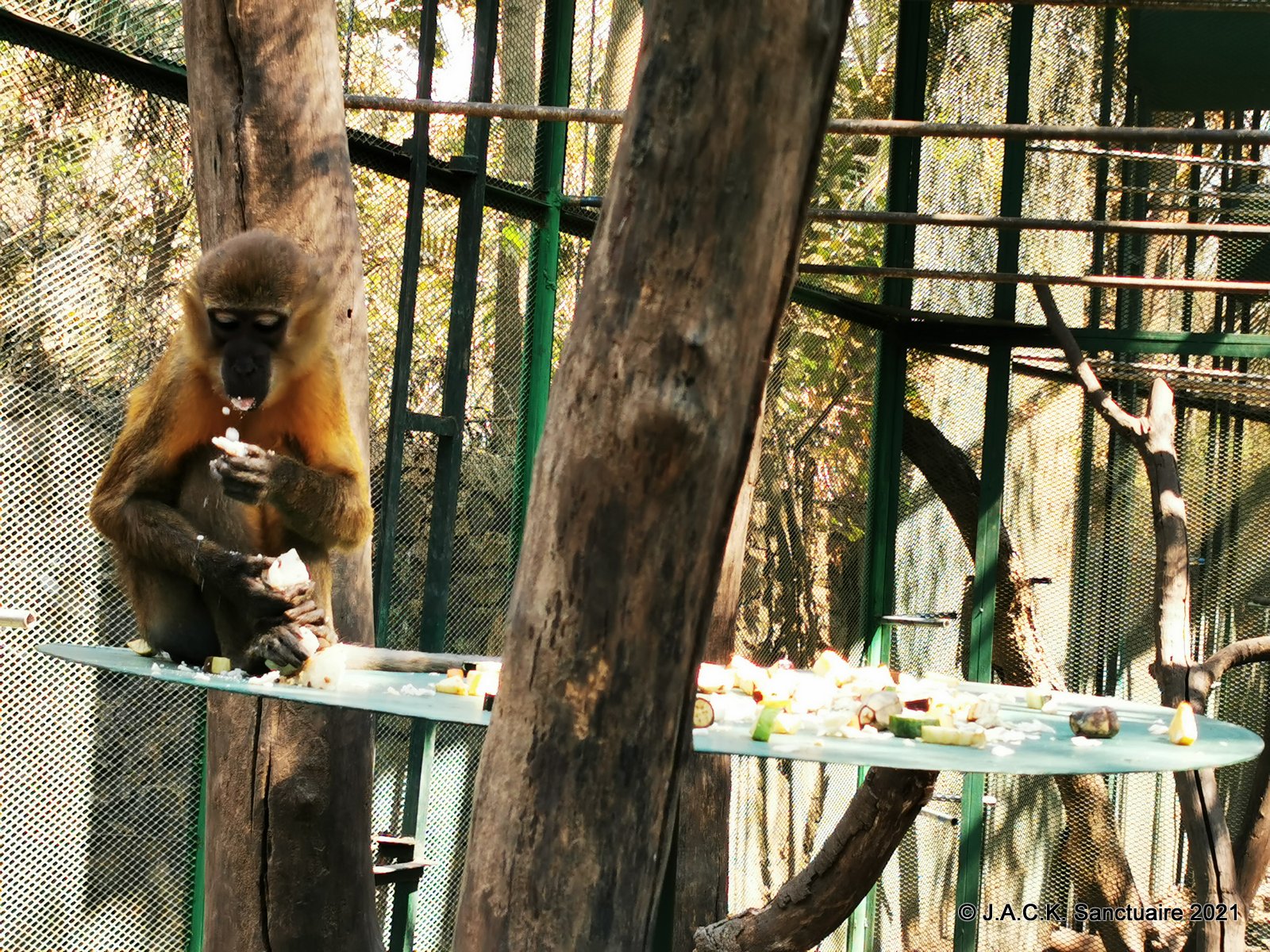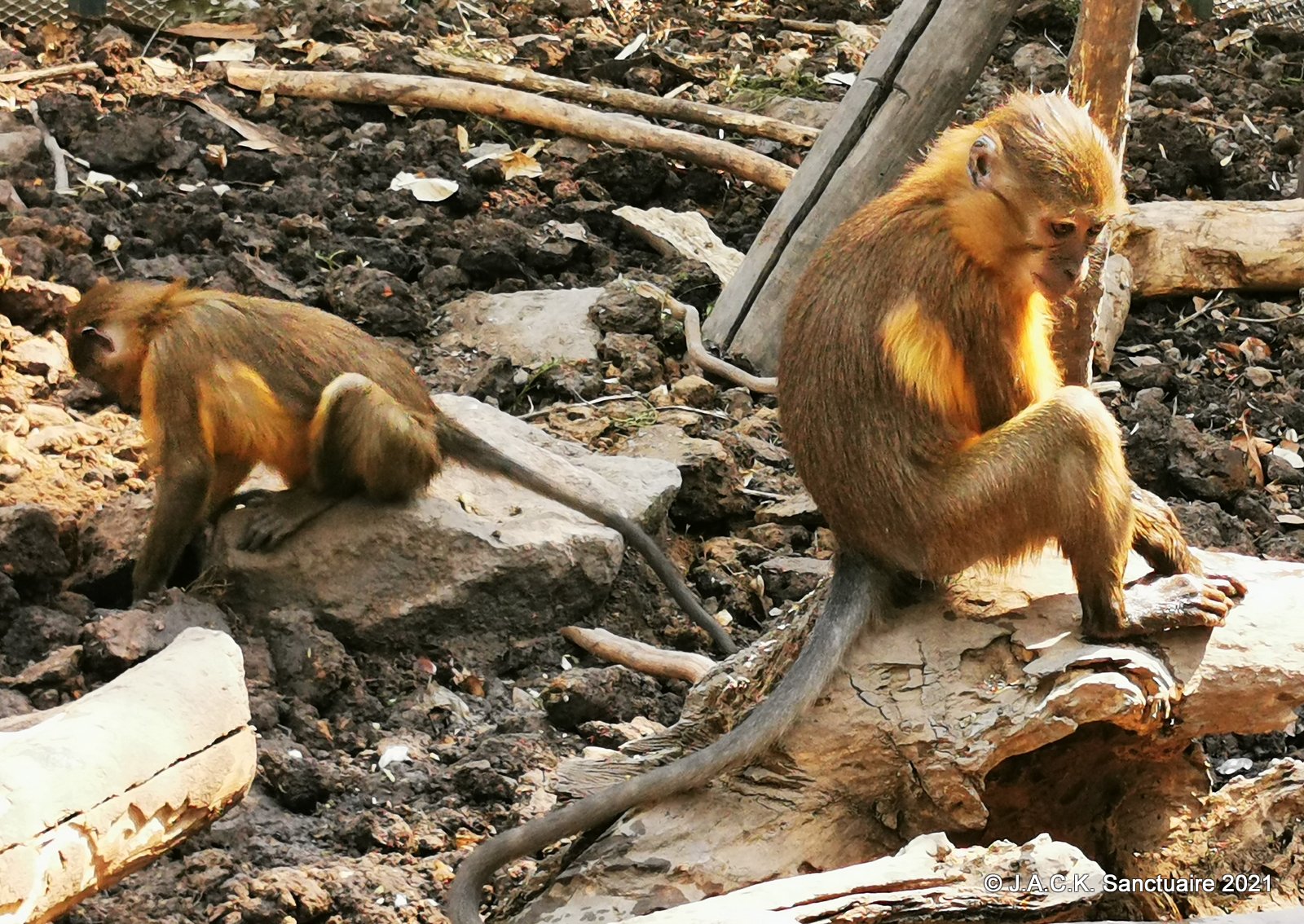 Les mangabeys dorés sont frugivores, nectarivores et ils adorent les graines et les insectes. Souvent, lors de l’enrichissement, nous leur donnons des branches/troncs morts remplis de termites. Un vrai délice!