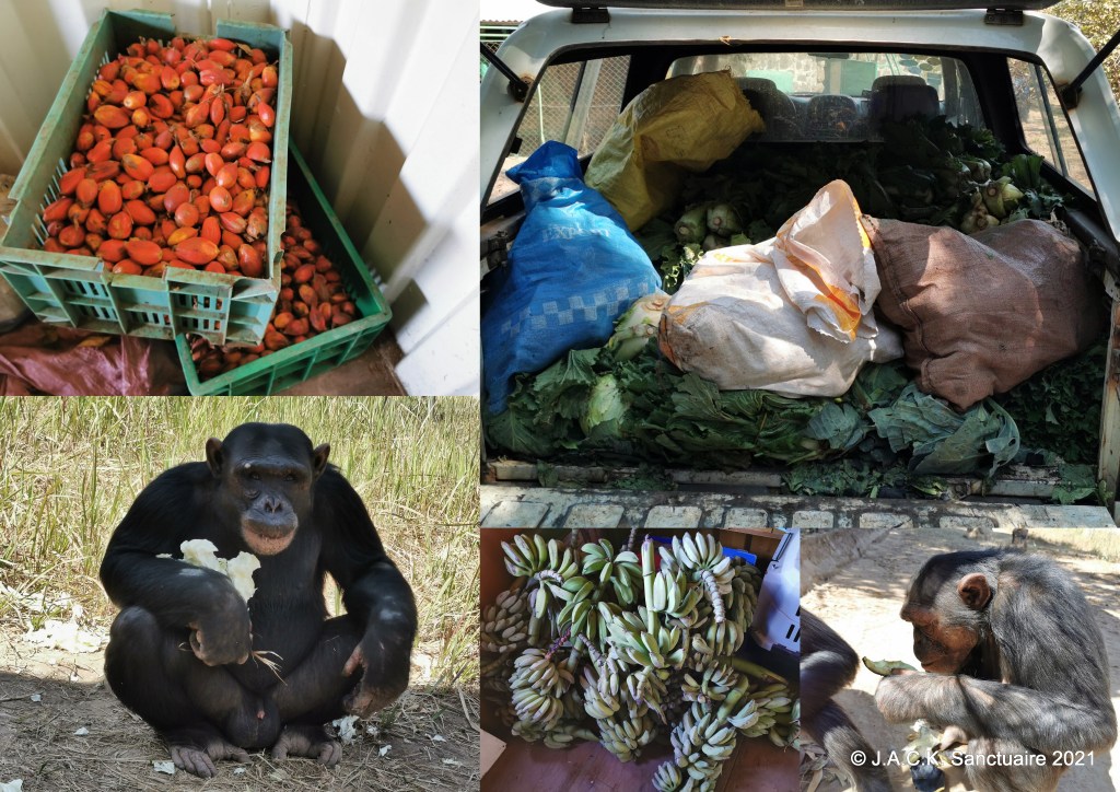 L’association J.A.C.K. arrive à récupérer des aliments invendus ou invendables d’un supermarché de Lubumbashi, mais cela ne suffit pas. La majorité des 35 chimpanzés sauvés par J.A.C.K. ont atteint l’âge adulte et leur consommation quotidienne varie entre 5 à 8kgs de nourriture par individu par jour. Si le centre n’arrive pas à fournir les quelques 250kg d’aliments au quotidien, les animaux se battent entre eux et ils peuvent s’en prendre aux soigneurs lors des nourrissages.