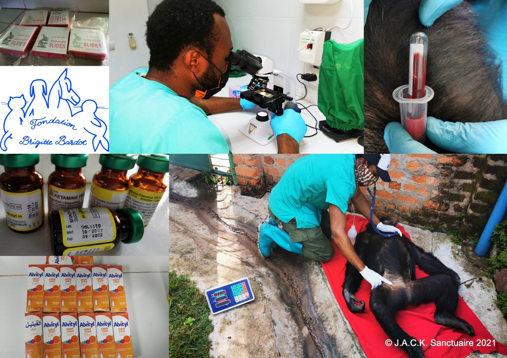 Au niveau vétérinaire, les soins apportés aux chimpanzés de J.A.C.K. vont de l’assistance vétérinaire en cas de blessures, à la pose d’implants contraceptifs, aux bilans de santé en passant par les analyses d’échantillons (sang, selles, urines) et les traitements à administrer.