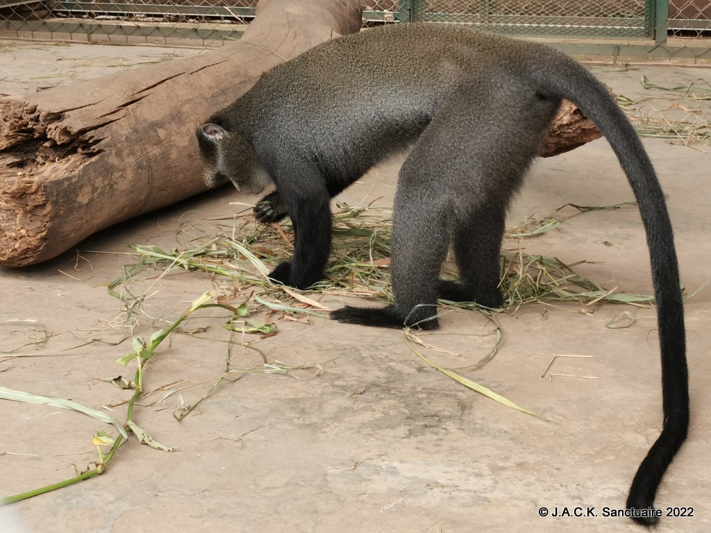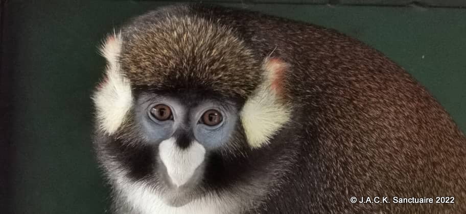 Quant à BOBO, il est un Hocheur à nez blanc (Cercopithecus nictitans). Nous l’avons également récupéré de la clinique vétérinaire où se trouvait NOUCHA.