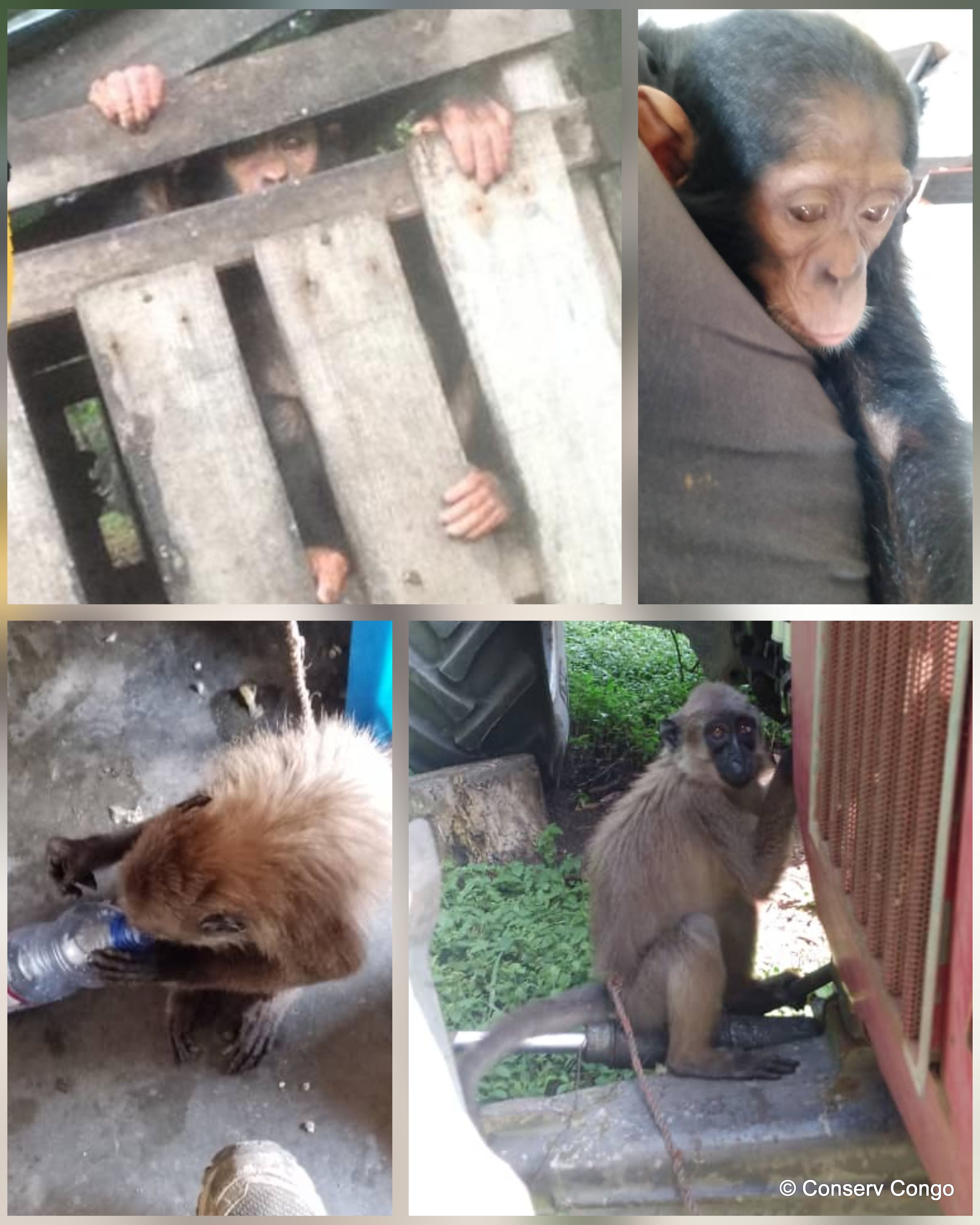 Un chimpanzé d’au moins 2 ans et un singe (Mangabey Agile) ayant à peu près le même âge ont été confisqués à Kinshasa.