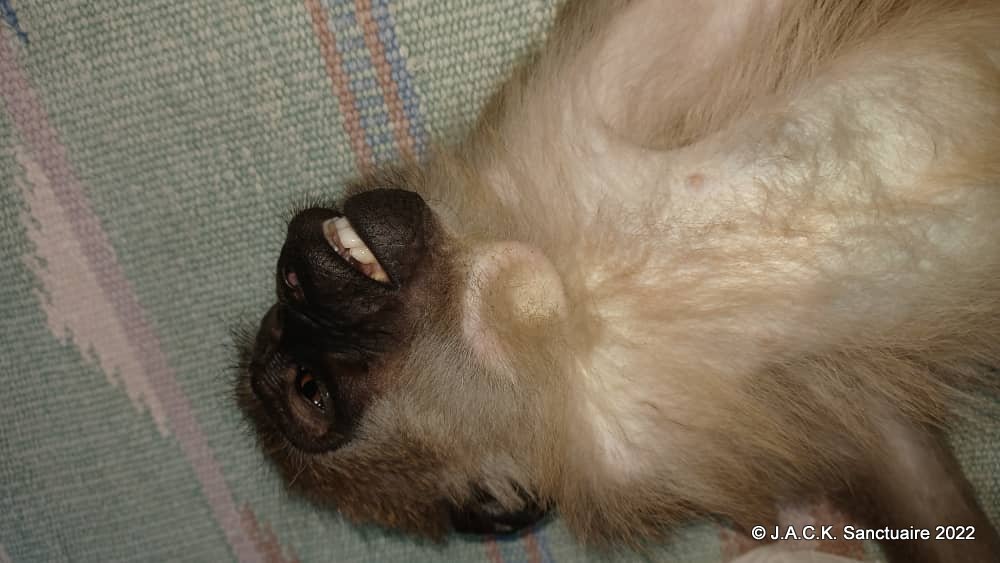 River, le petit mâle Mangabey agile transféré à J.A.C.K. fin avril dernier (voir l’article sur le lien suivant : https://jackchimpscongo.org/2022/05/06/confiscation-insolite-dans-un-ecolodge/), est arrivé avec une capsule en plastique dans sa bouche. Ces primates ont des abajoues comme les écureuils où ils stockent de la nourriture et, l’abajoue droite était anormalement gonflée en permanence.