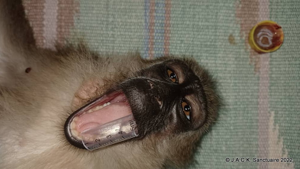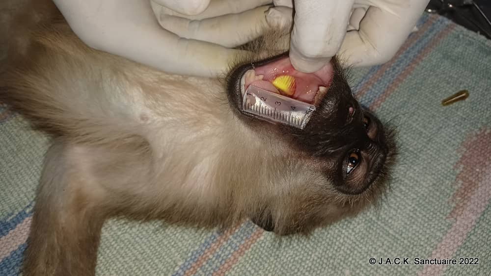 River, le petit mâle Mangabey agile transféré à J.A.C.K. fin avril dernier (voir l’article sur le lien suivant : https://jackchimpscongo.org/2022/05/06/confiscation-insolite-dans-un-ecolodge/), est arrivé avec une capsule en plastique dans sa bouche. Ces primates ont des abajoues comme les écureuils où ils stockent de la nourriture et, l’abajoue droite était anormalement gonflée en permanence.
