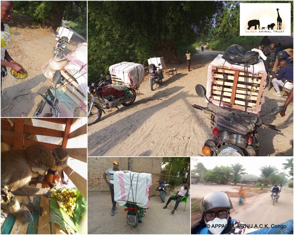 En effet, en juin dernier, cette généreuse famille a tenu à supporter le transfert des primates durant le long voyage (plus de 520km) de 3 jours à moto partant de Lodja vers Mbuji-Mayi. 4 motos ont été louées afin d’assurer le transport sous la coordination de l’ONG APPACOL-PRN de Mr Héritier MPO qui a minutieusement encadré les primates lors du voyage.