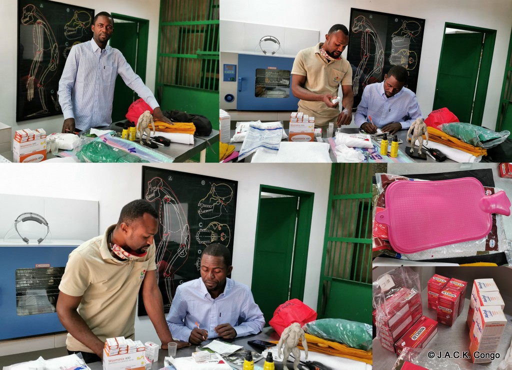 Seringues, multivitamines, vermifuges, désinfectants, antibiotiques mais aussi bouillottes, gants, cages de transport, etc. lui ont été fournis par l’OLSEN ANIMAL TRUST et Madame Linda, deux grands sponsors de J.A.C.K. Héritier étant sur le départ, il a de quoi ramener à Lodja où il vit et fait toutes les confiscations et sauvetages.