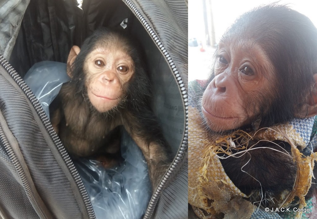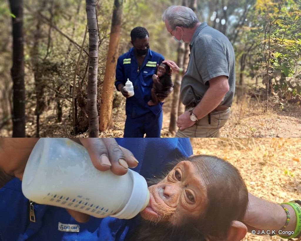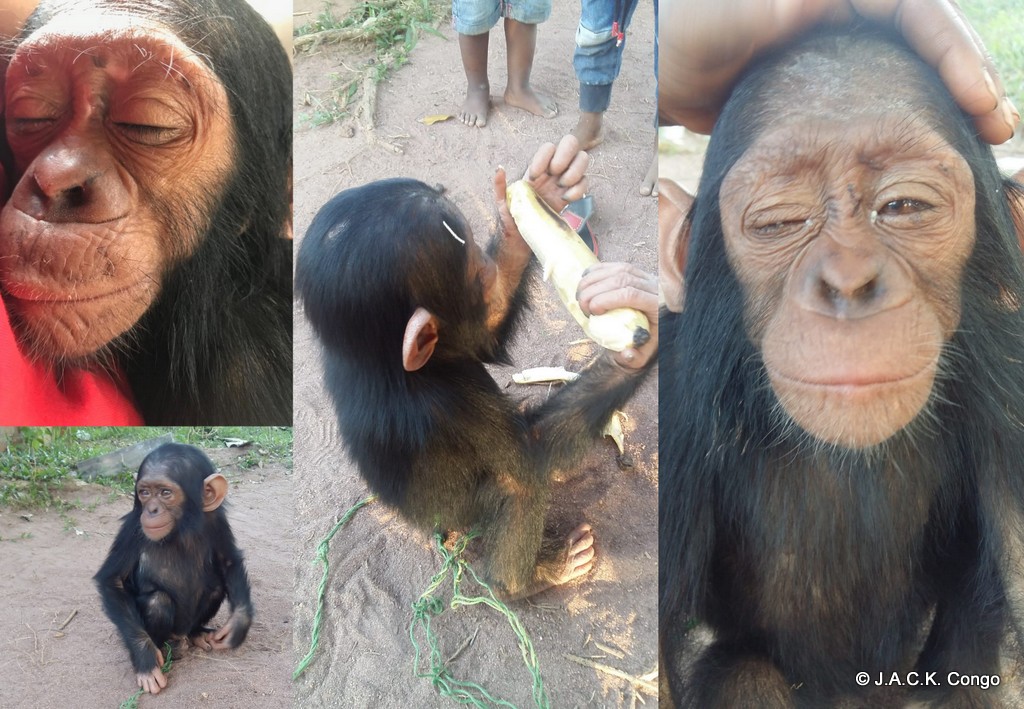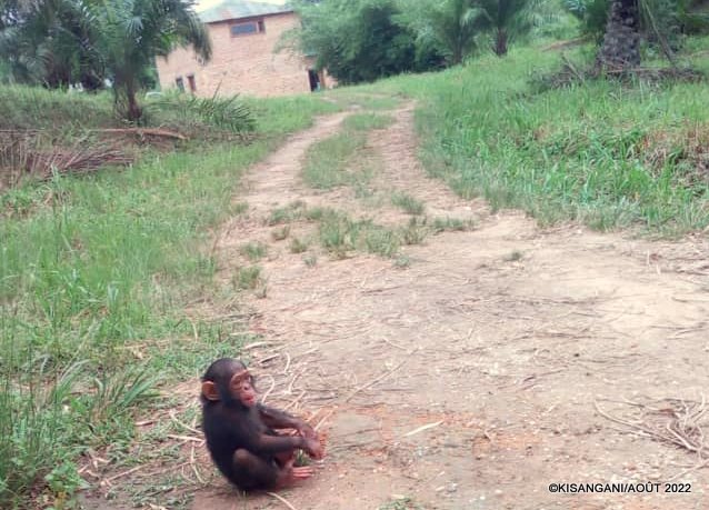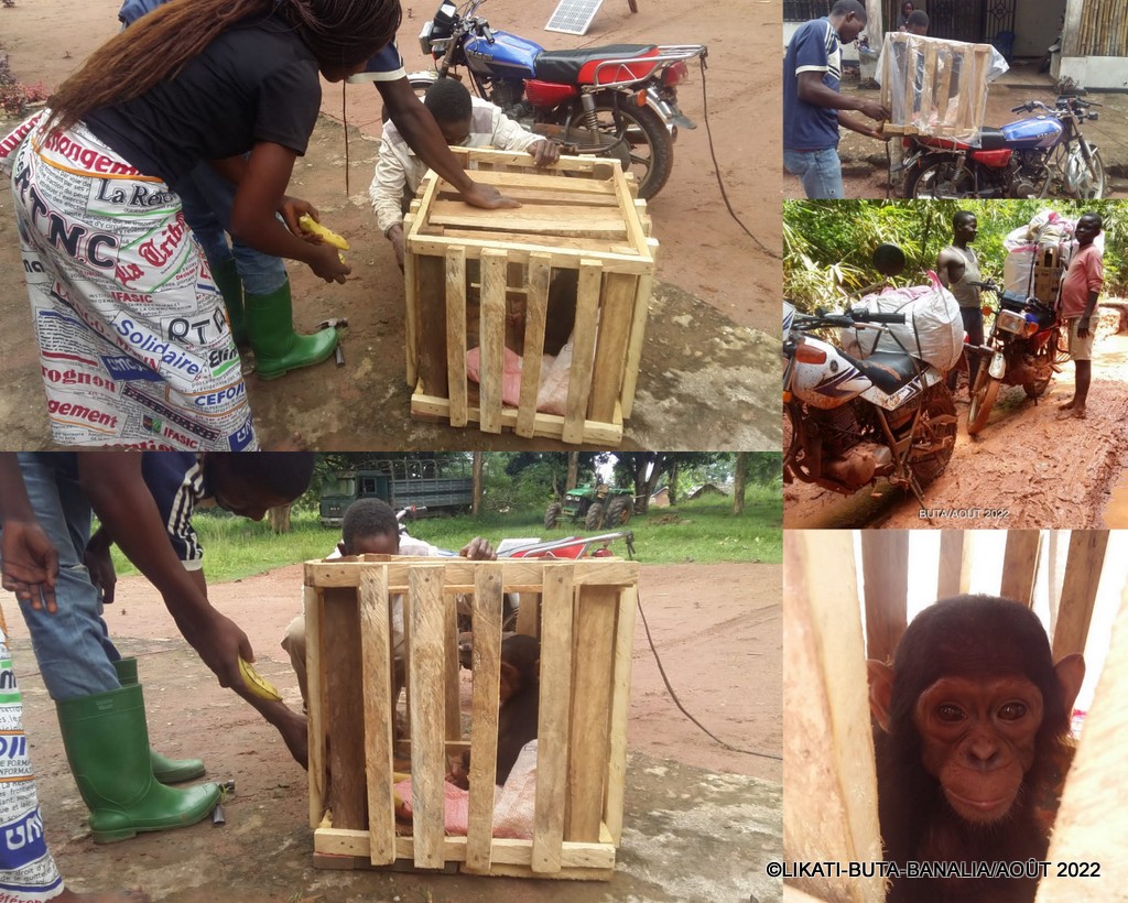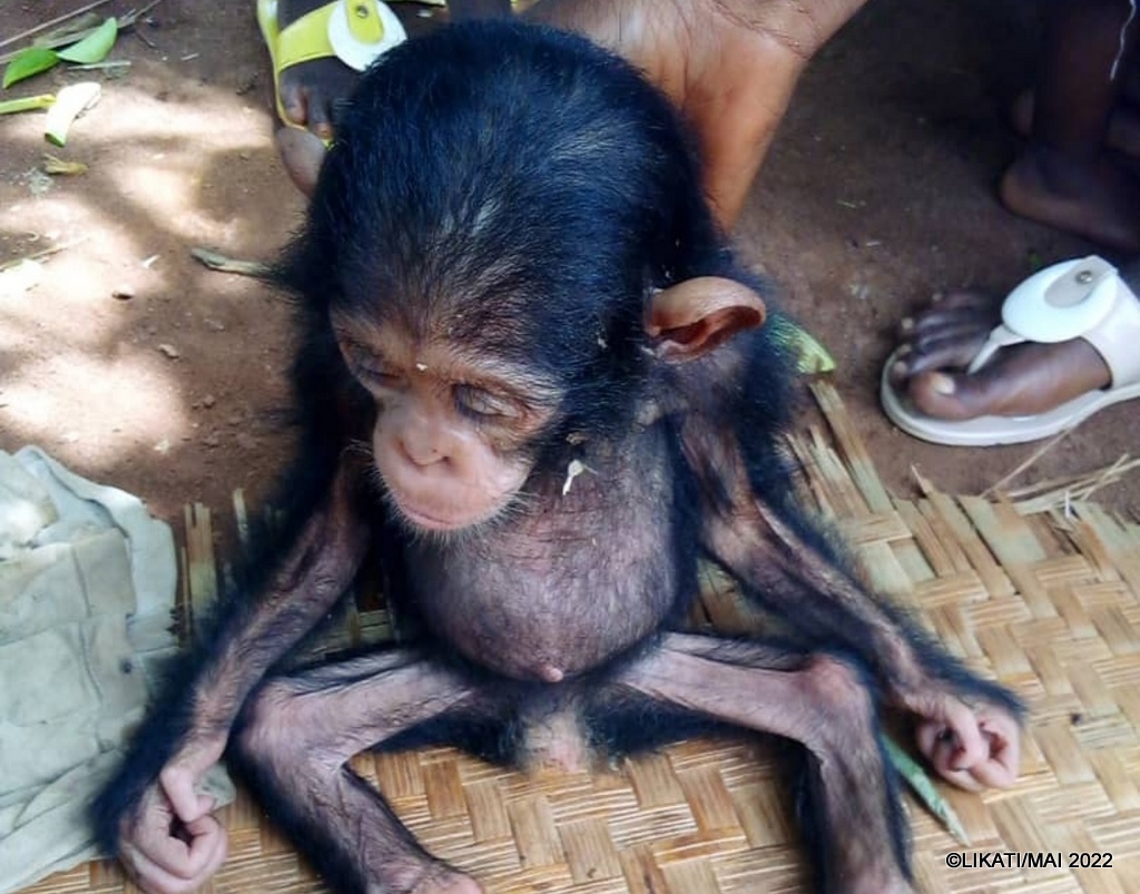 En janvier 2022, nous avons été contactés de Likati (Bas Uélé) par une personne sensible à la cause animale et qui venait de sauver César, un bébé chimpanzé qui était en vente sur un marché local. Ce dernier était fort blessé et a été de suite mis sous traitement grâce aux précieux conseils vétérinaires de notre Dr Christian.