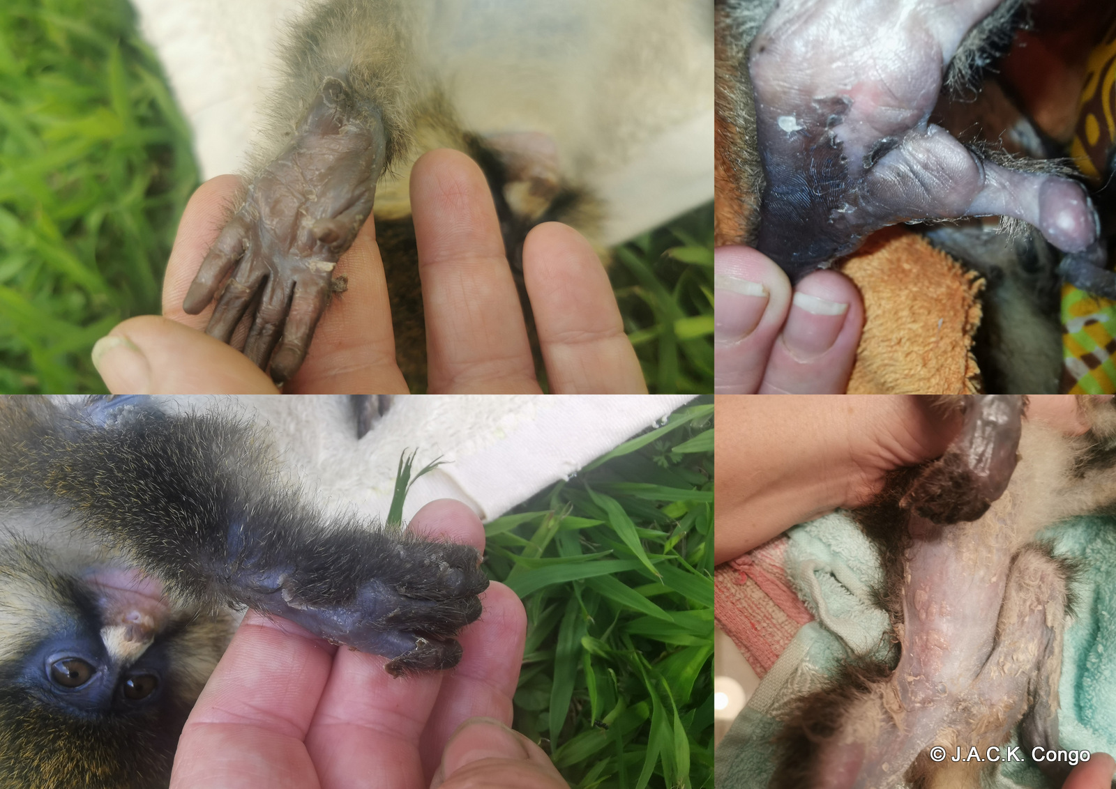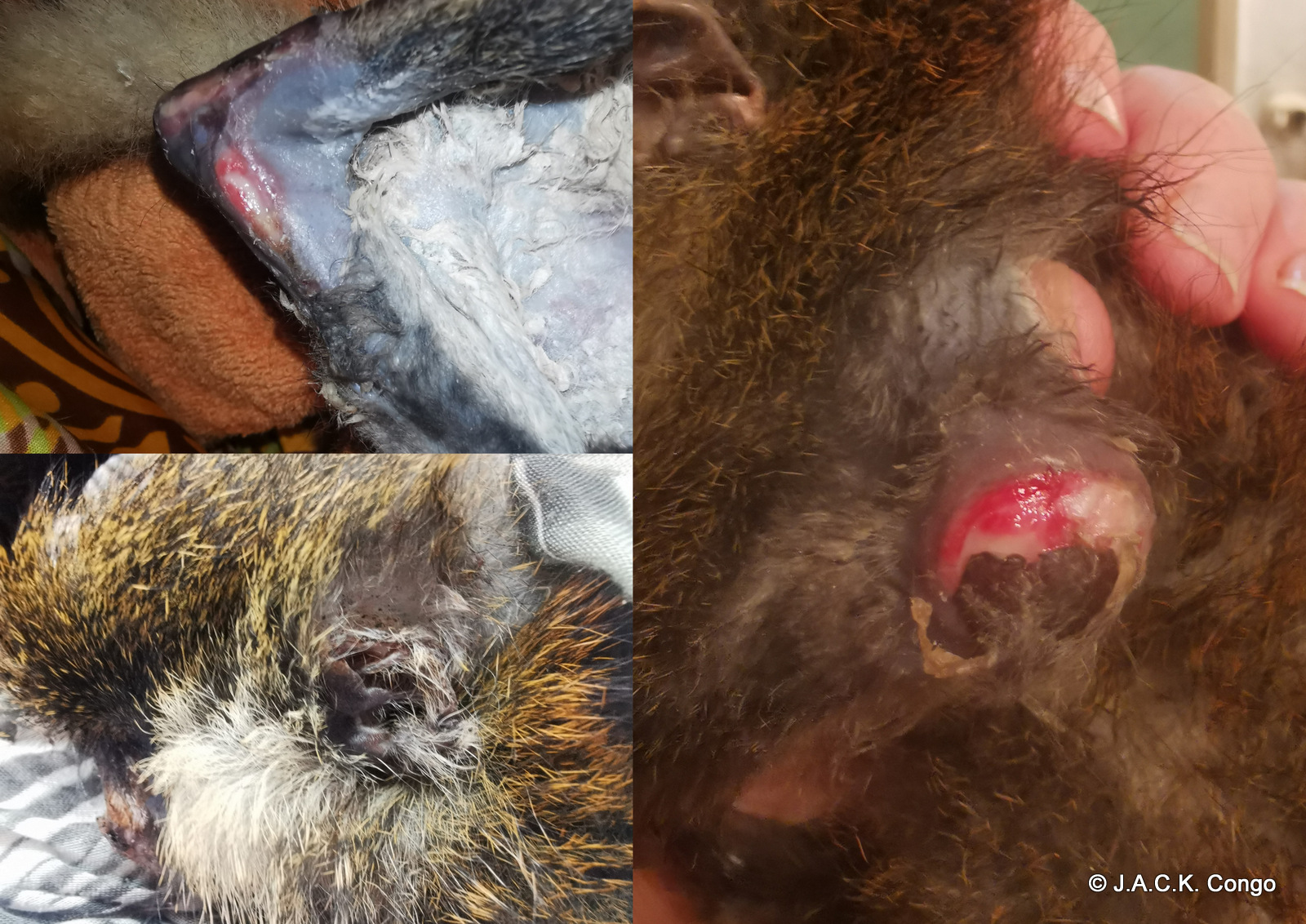 Infesté de puces, de tics, de vers de Cayor, le petit primate avait des plaies purulentes sur les bras et les jambes. Il était vulnérable, en manque d’attention et d’affection. Il fuyait à chaque fois que je tentais de le câliner, de le réconforter. Les trafiquants l’avaient gardé dans des conditions lamentables et l’avaient très certainement battu, frappé… Il lui manquait l’oreille gauche.