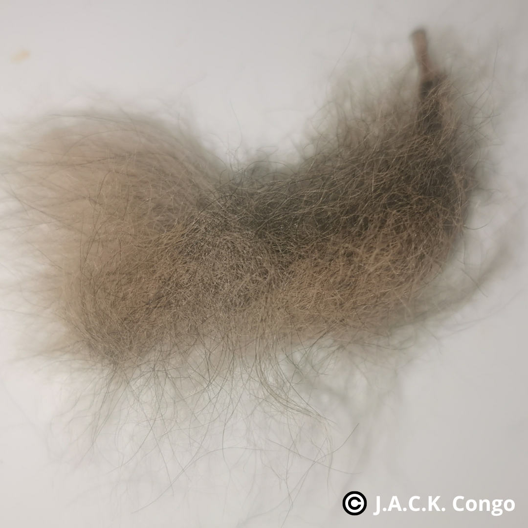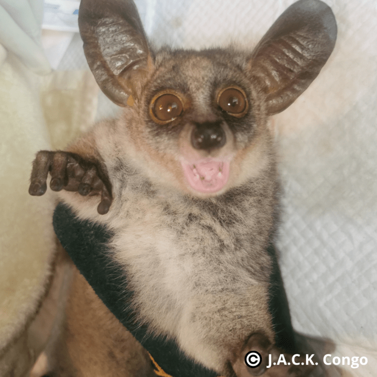 RUSHI est un jeune galago sauvé il y a quelques jours par JACK. Les trafiquants avaient attaché sa queue aux barreaux de sa cage pour éviter qu’il ne bouge.