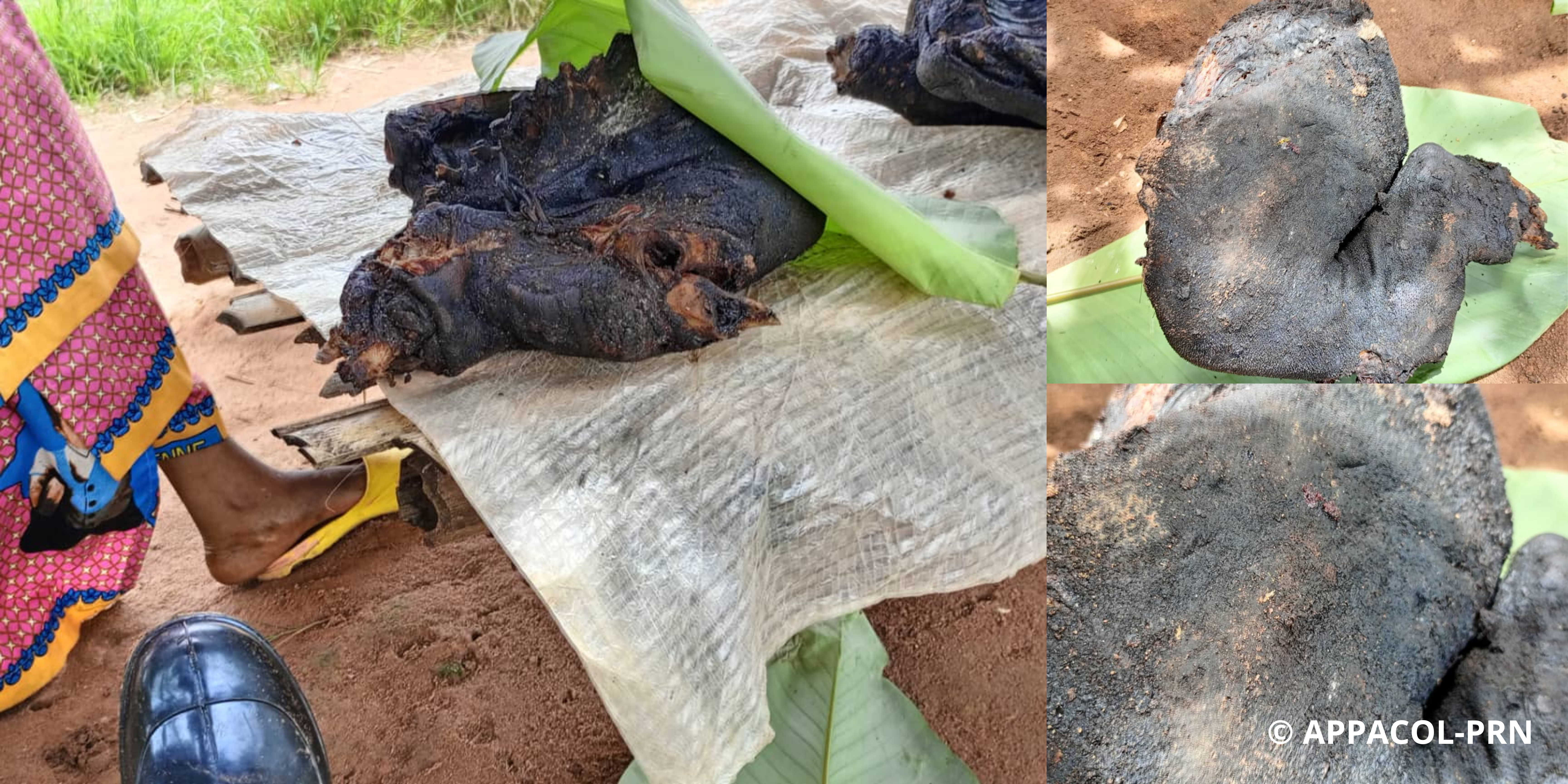 La cuisse boucanée d’un chimpanzé adulte est proposé, aux yeux de tous, à la vente pour 55 000 Francs Congolais soit 25$ !! Lorsque nous demandons au vendeur où se trouvent la tête, les mains et les pieds, on nous répondra que cela est réservé aux chasseurs pour réaliser des fétiches !