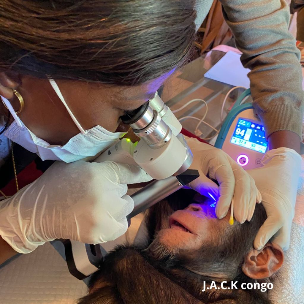 Avec une profonde tristesse, nous devons vous informer que notre Bere fait face à un problème de santé oculaire inquiétant. Lors d’un examen de routine effectué par notre équipe vétérinaire, nous avons remarqué que l’œil droit du jeune chimpanzé tout récemment sauvé présentait une pellicule opaque. Nous avons fait appel à une spécialiste pour qu’elle examine de plus près le cas de notre petit protégé.