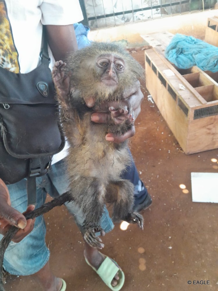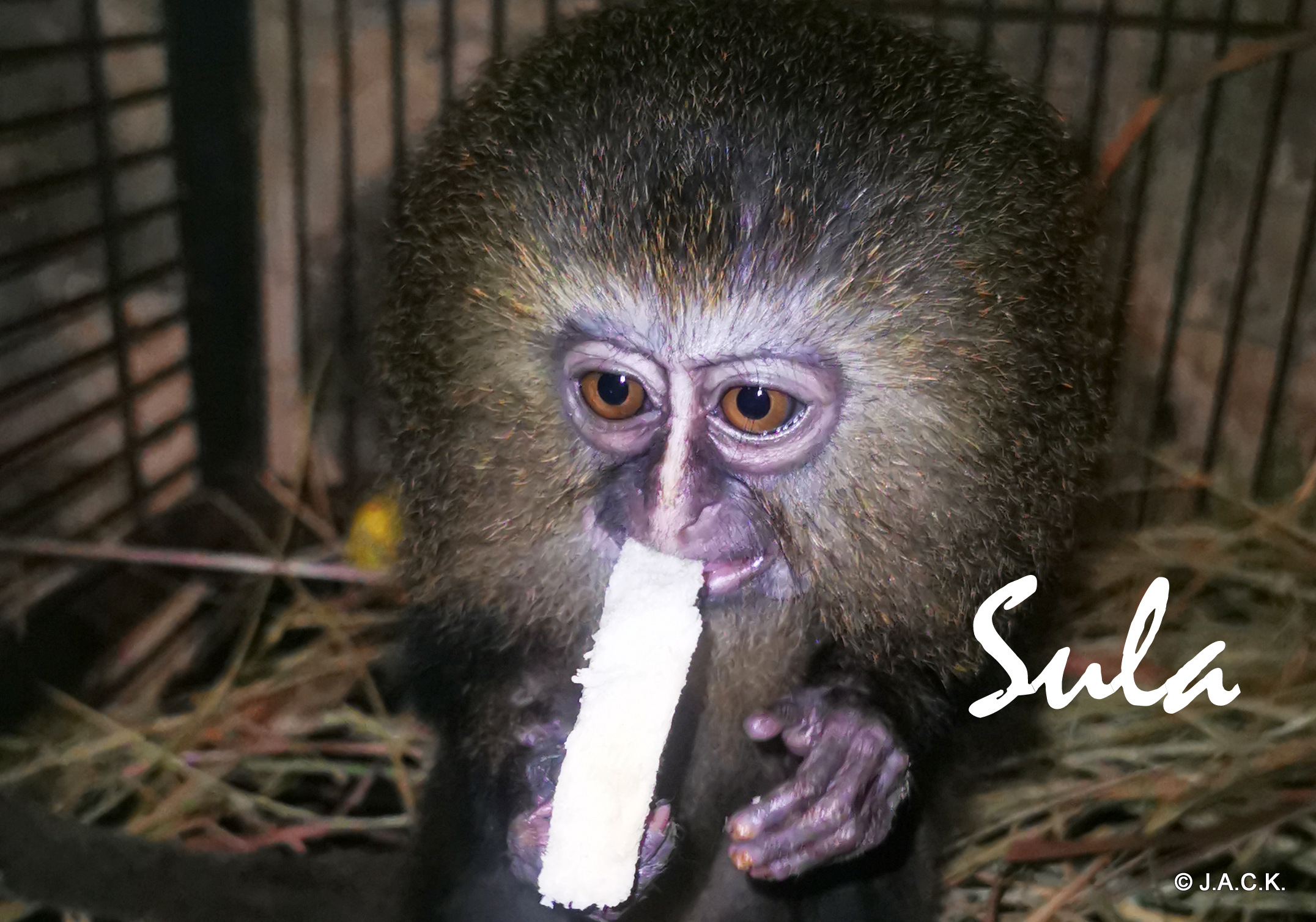 En décembre 2023, Sula, un bébé lesula (Cercopithecus lomamiensis), espèce rare et endémique de la République Démocratique du Congo, a été confisquée à Lomé, au Togo. Elle se trouvait parmi 37 autres singes destinés à la Thaïlande. À peine âgée d’un an, Sula est arrivée dans un état déplorable à J.A.C.K. : malnutrie, infestée de parasites, et ayant besoin d’une attention constante.