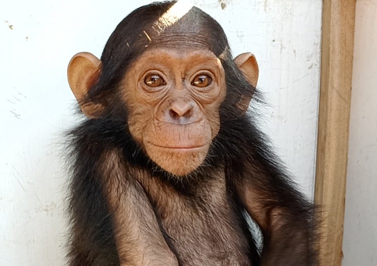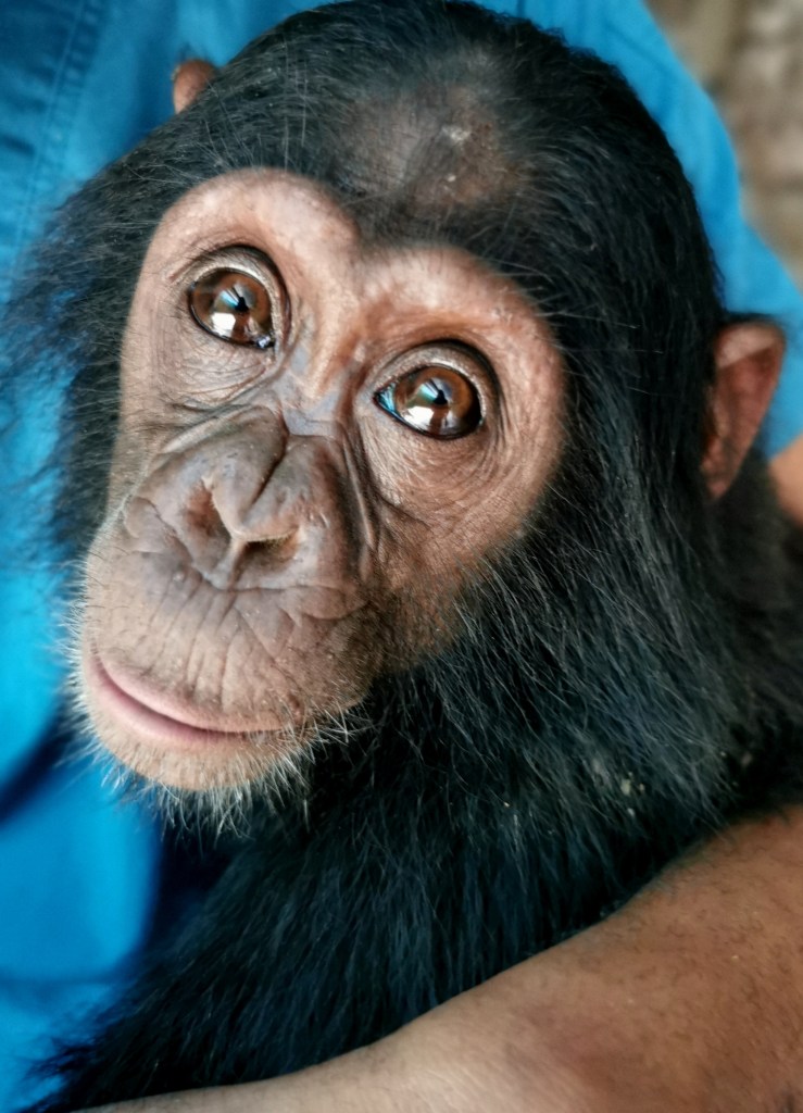 Sana is a tiny female chimp, less than a year old, seized from a hunter at the end of August 2023 in Ituri. Brought to the Okapi Wildlife Reserve in Epulu, her transfer was organized so that she could arrive at the J.A.C.K. sanctuary as quickly as possible. She was accompanied by a young blue monkey.