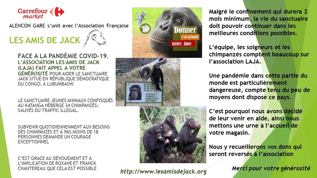 Tout comme en 2020 et malgré les caprices de la crise sanitaire, LE CARREFOUR MARKET D’ALENÇON GARE soutient notre action de Conservation d’une espèce en voie d’extinction : le chimpanzé en RD Congo! Passez à l’Accueil et n’hésitez pas à faire un geste – une tirelire et des flyers sur notre association en France vous attendent! MerciLireLire la suite « Merci au Carrefour Market d’Alençon Gare »