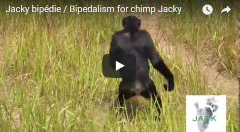 JACKY – La bipédie est bien plus courante qu’on ne le pense chez les chimpanzés; ils l’a préfèrent lorsque leurs mains sont pleines (le cas de JACKY) ou quand ils ont besoin d’un avantage visuel (s’ils sont dans des herbes hautes par exemple…)