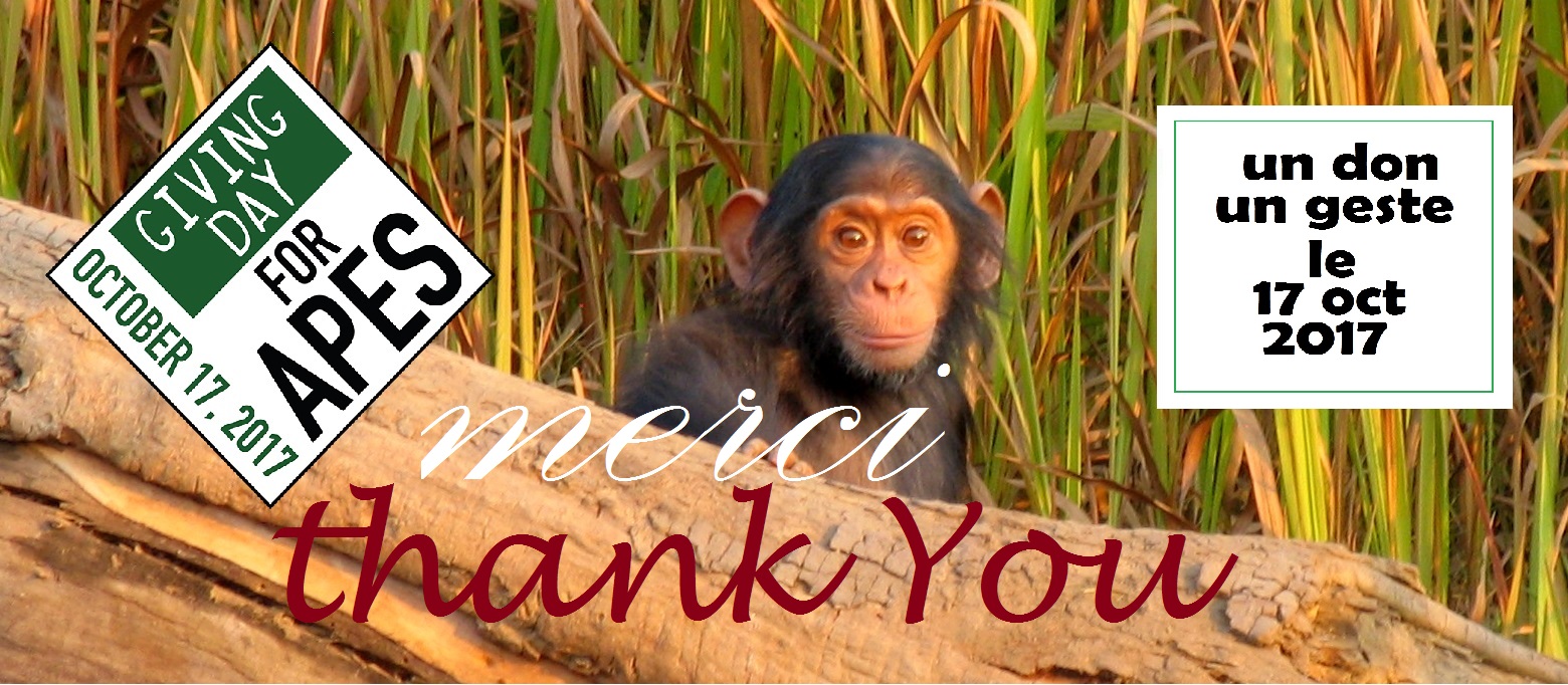 La collecte intitulée « GIVING DAY FOR APES » dont nous vous avions parlée il y a quelques jours est arrivée à sa fin. Cette collecte mondiale finissait le 17 octobre dernier, mais nos amis des USA et d’Europe ont continué de nous envoyer des dons au-delà de cette date et nous arrivons petit à petit àLireLire la suite « Collecte clôturée! »